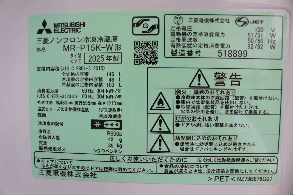 三菱電機 MITSUBISHI ELECTRIC Pシリーズ(146L・幅48cm・右開き・2ドア・マットホワイト) MR-P15K-W 2025年製 未使用展示品