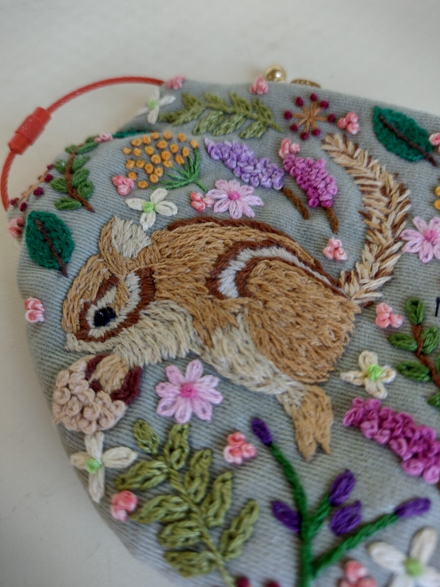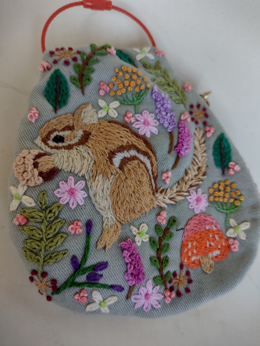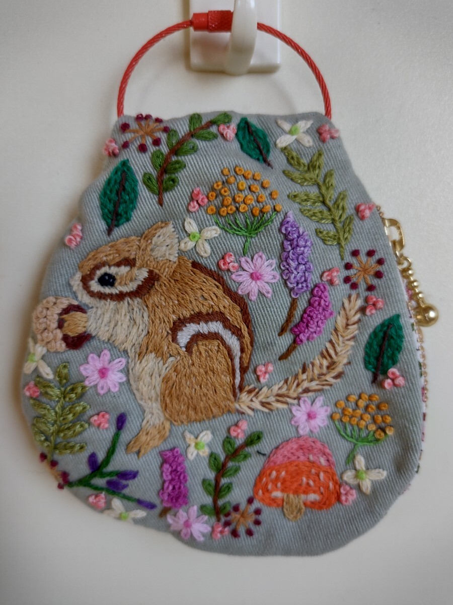 リスの周りにきのこ、葉っぱ、お花を全面に両面手刺繍しましたキーポーチです。