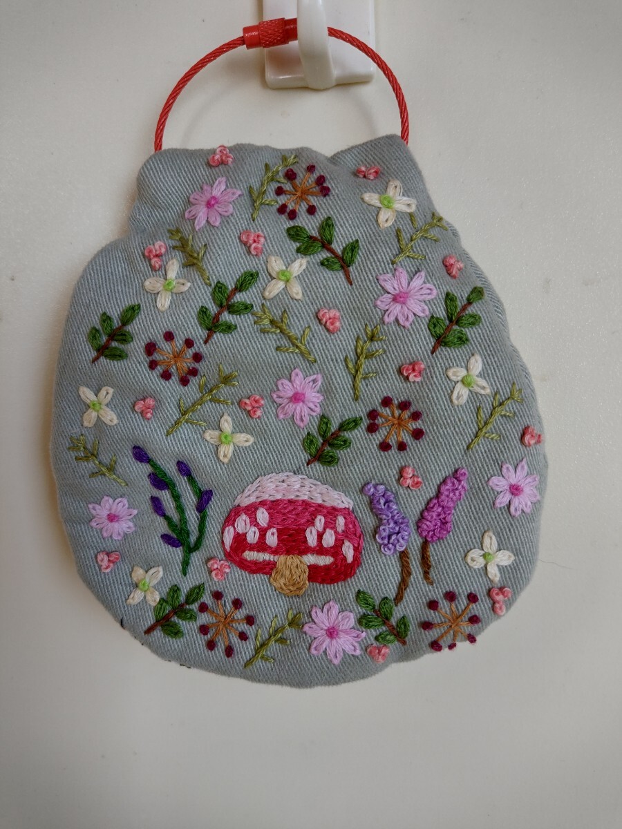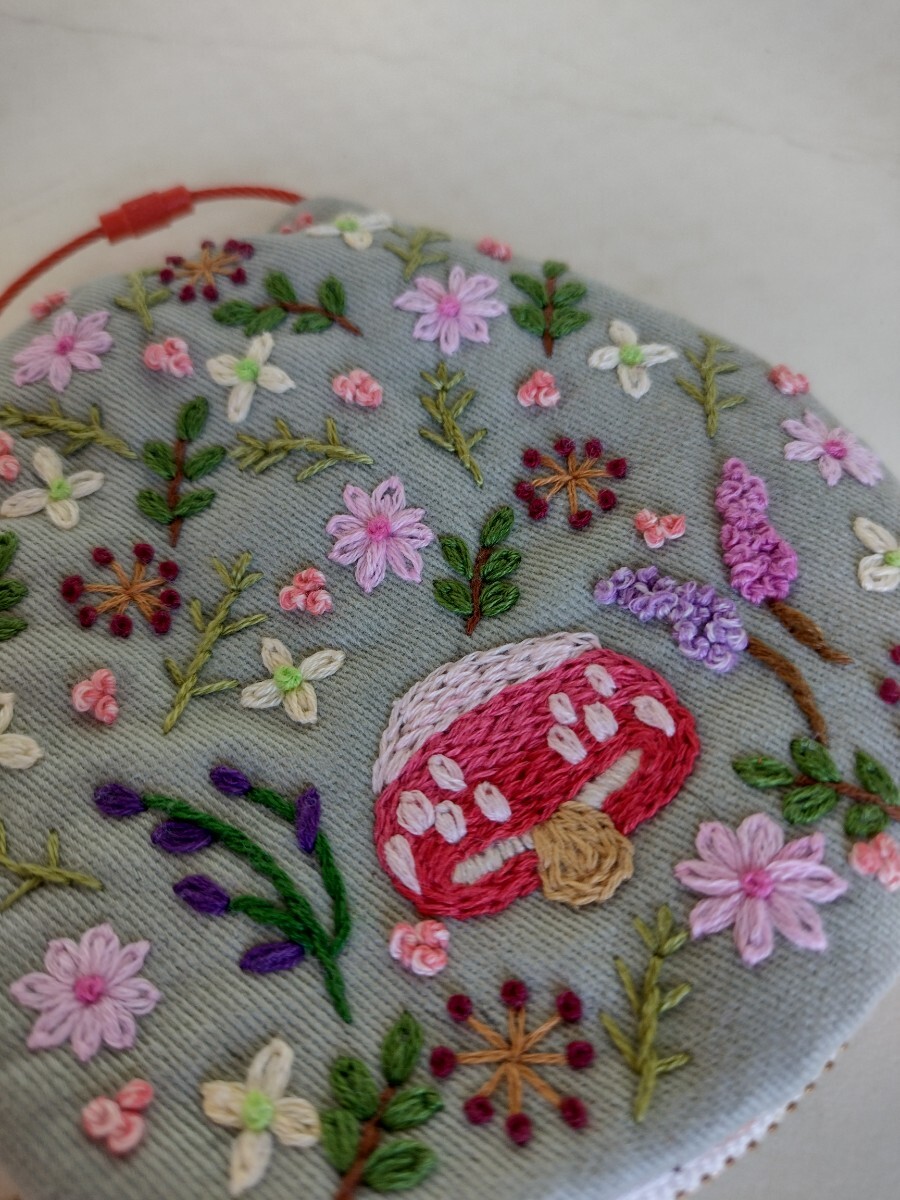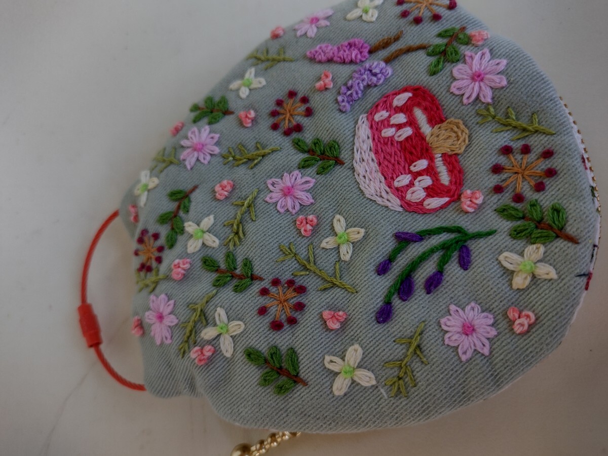 リスの周りにきのこ、葉っぱ、お花を全面に両面手刺繍しましたキーポーチです。