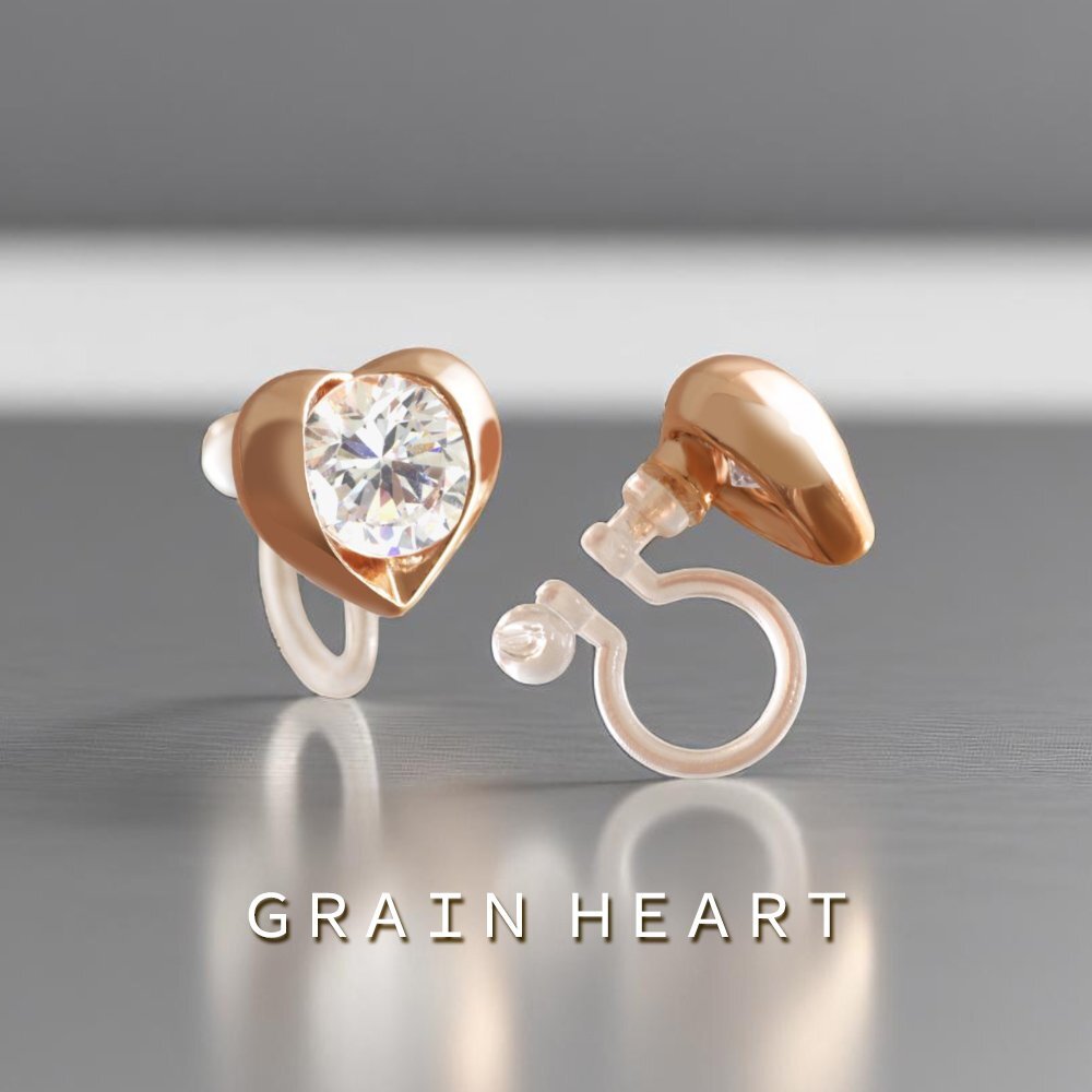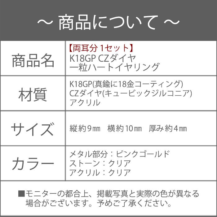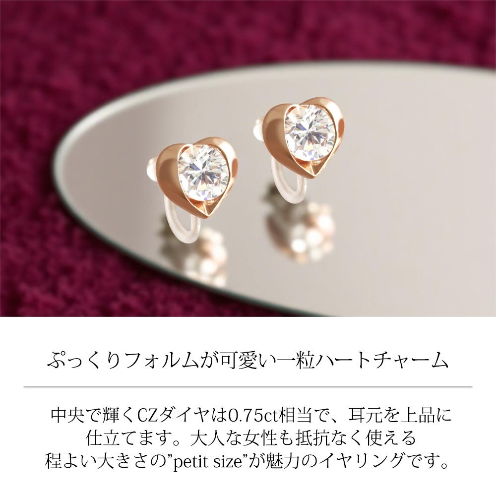 新品/イヤリング/K18GP/レディース/一粒/ハート/18金/18kコーティング/ピンクゴールド/ピアス見え/痛くない/樹脂/金属アレルギー/ダイヤ/CZ