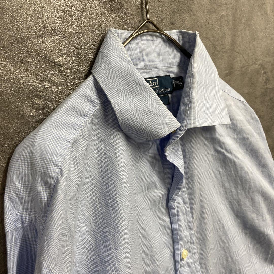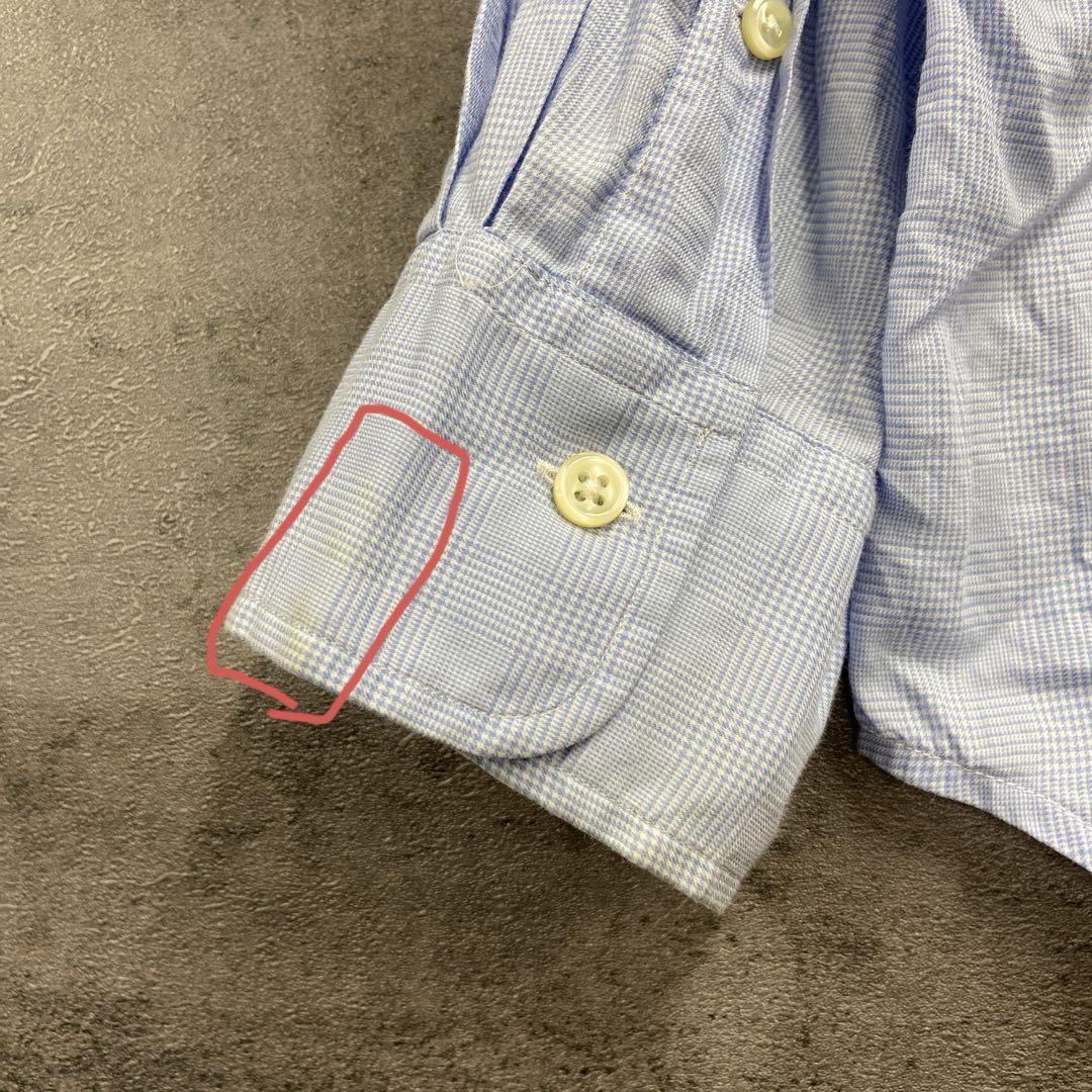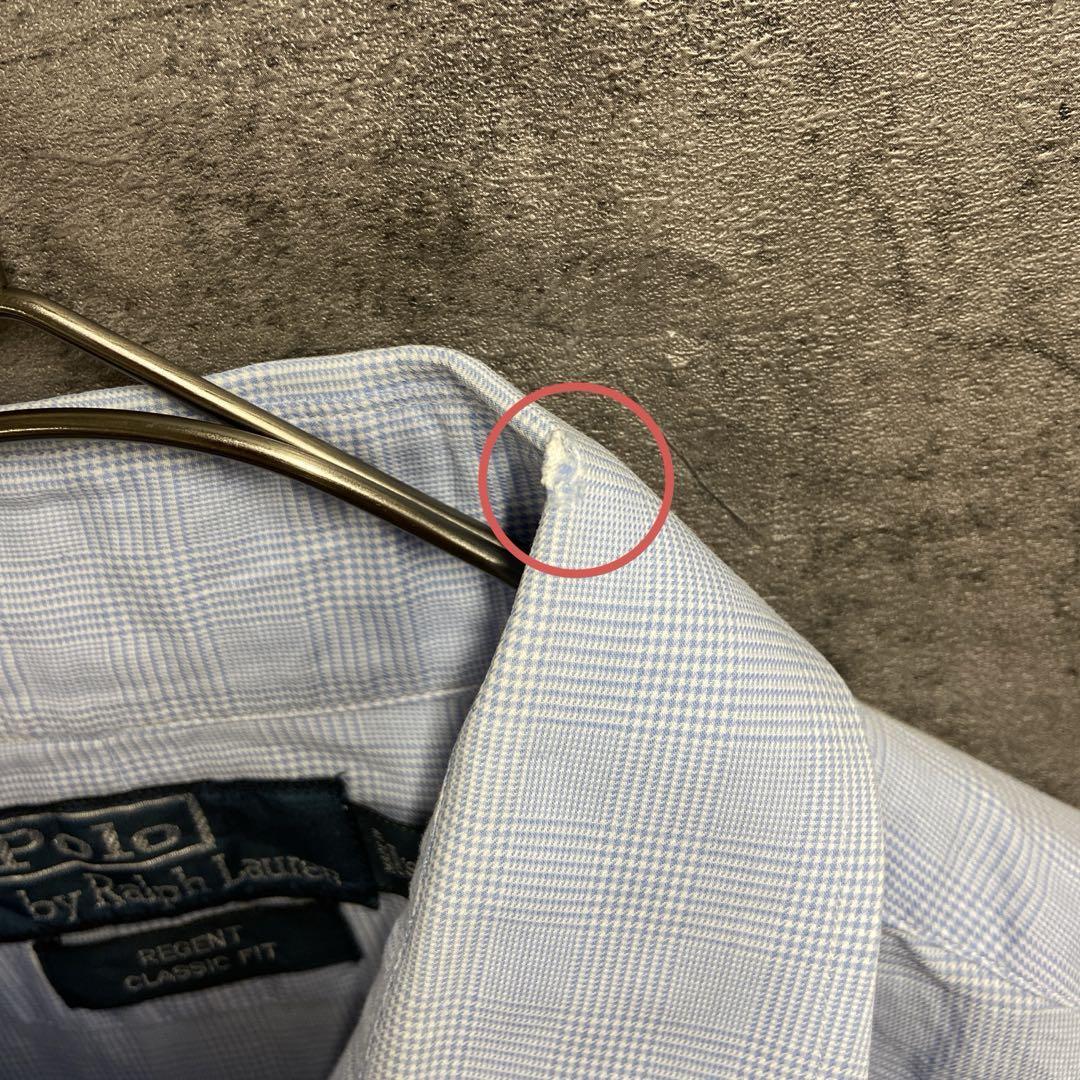 爽やかなサックスブルー系ギンガムチェックが特徴のポロラルフローレン長袖シャツです。コットン100%素材で着心地抜群。襟元や袖口、前身頃に汚れが見受けられますので必ず写真にてご確認ください。