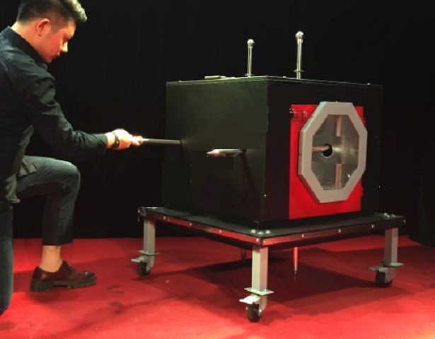 それから、演者は箱の中央に1本のチューブを挿入します。