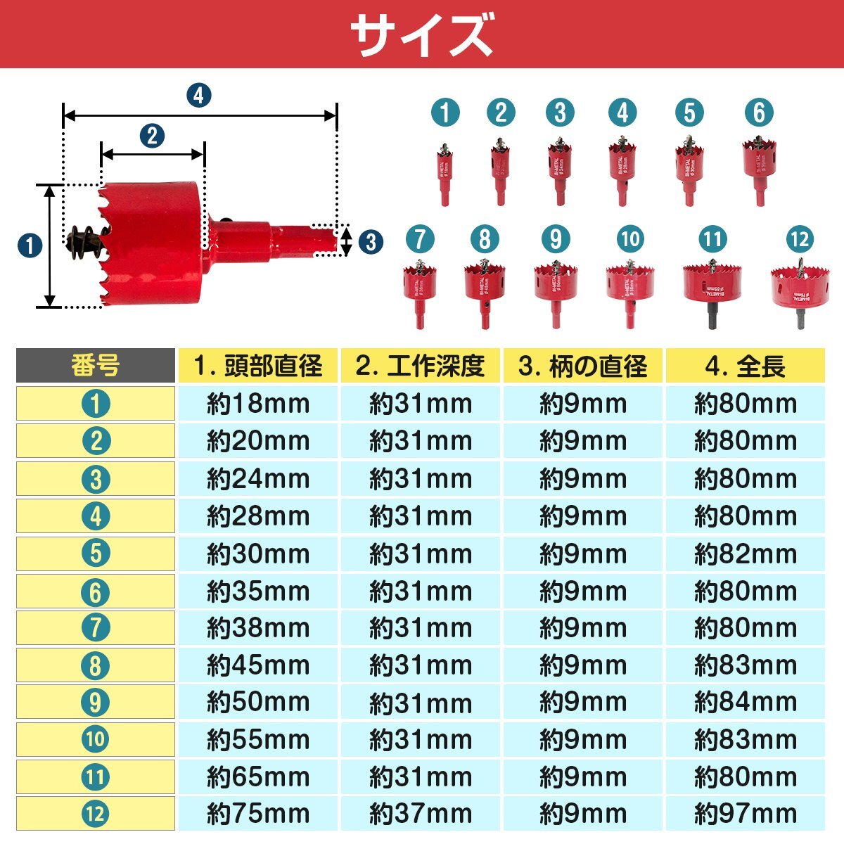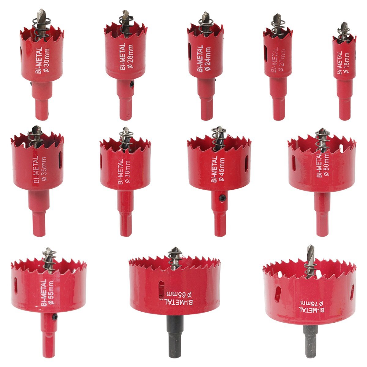 12点 セット 18mm/20mm/24mm/28mm/30mm/35mm/38mm/45mm/50mm/55mm/65mm/75mm バイメタル ホールソー 穴あけ ドリル ビット