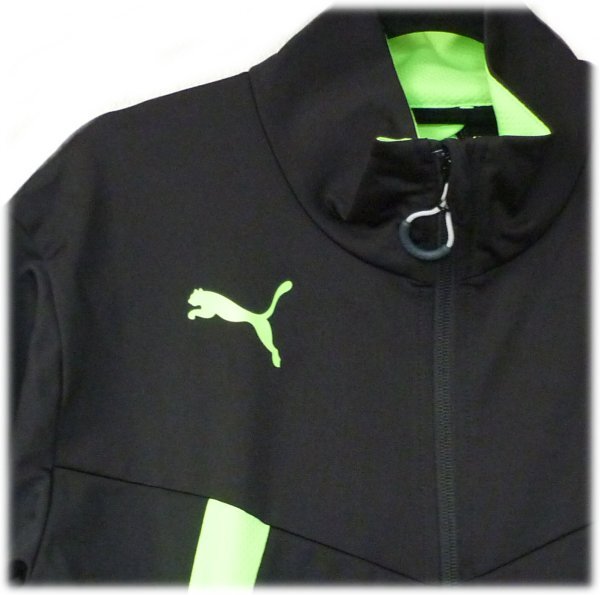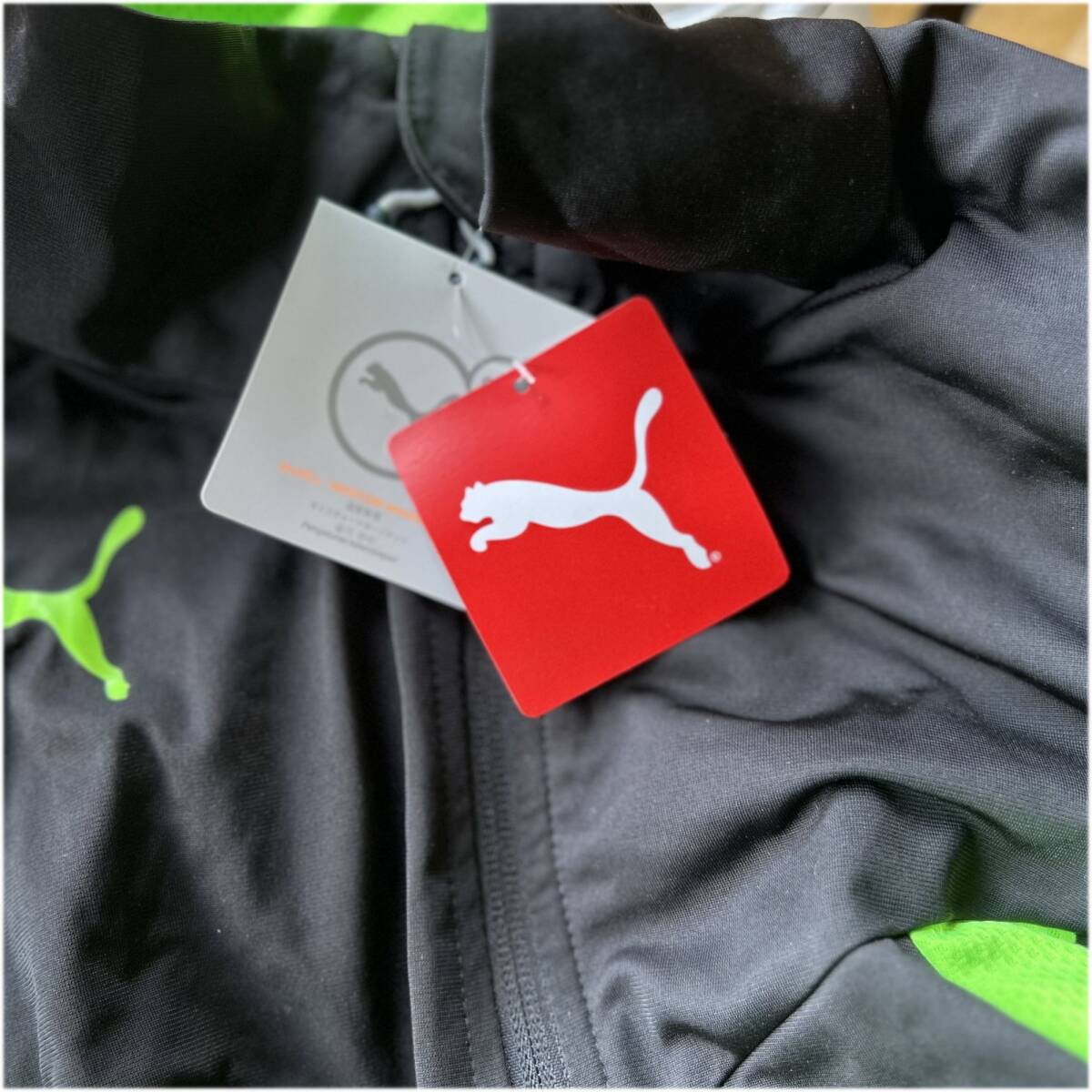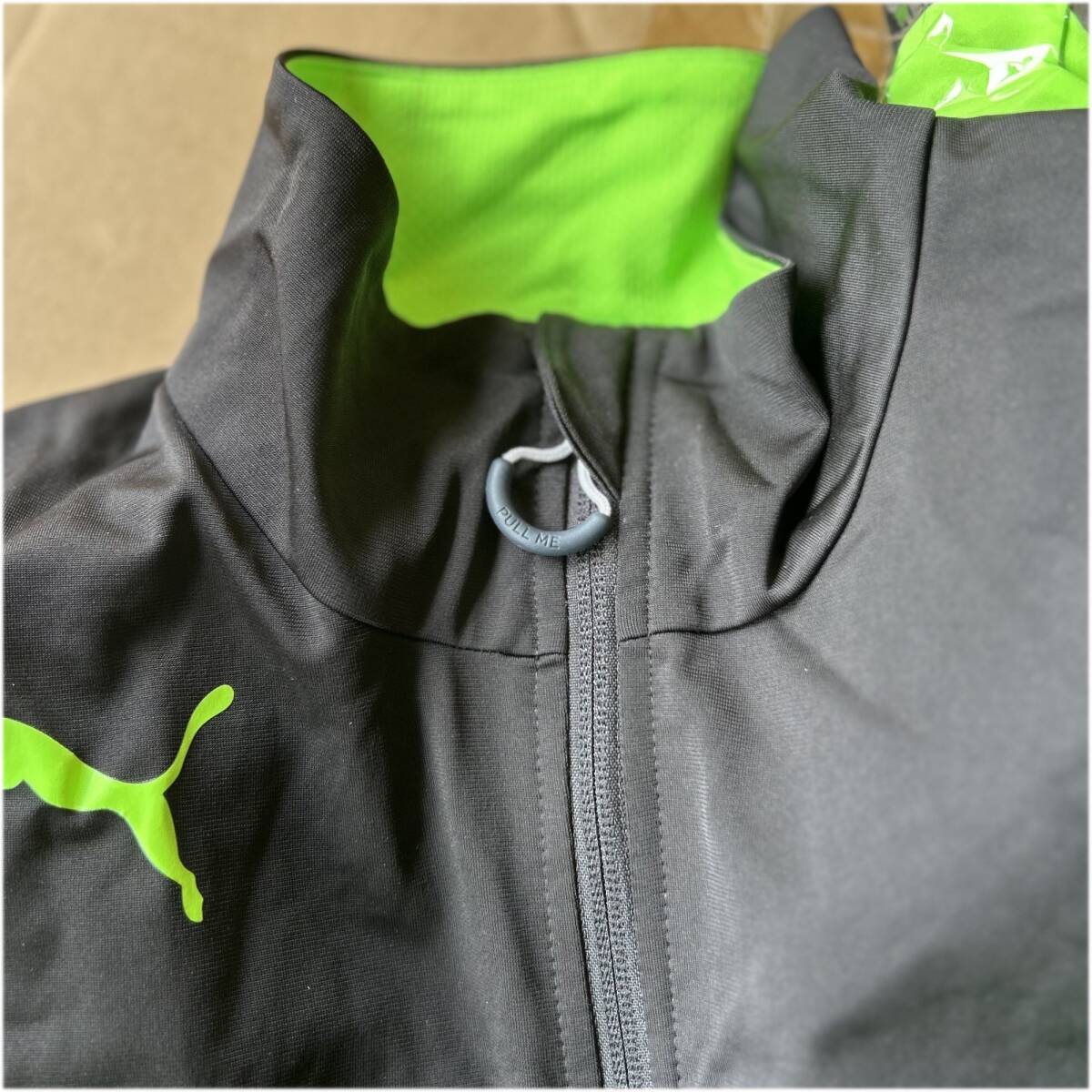 新品未使用品プーマのジャージトップスです。 wp1043ポリエステル製で表地は少しつるっとした手触りで、内側はフリースっぽいしっとりとした手触りの生地です。黒地に蛍光の黄緑で夜や早朝のトレーニングにもぴったり。両サイドにポケットあり。dry CELLで速乾性があります。定価8100円(税込)の品です。PUMAはワンサイズUP表示ですのでタグはМですが実際のサイズはLサイズです。サイズ L 身丈70cm身幅55cm袖丈67.5cm