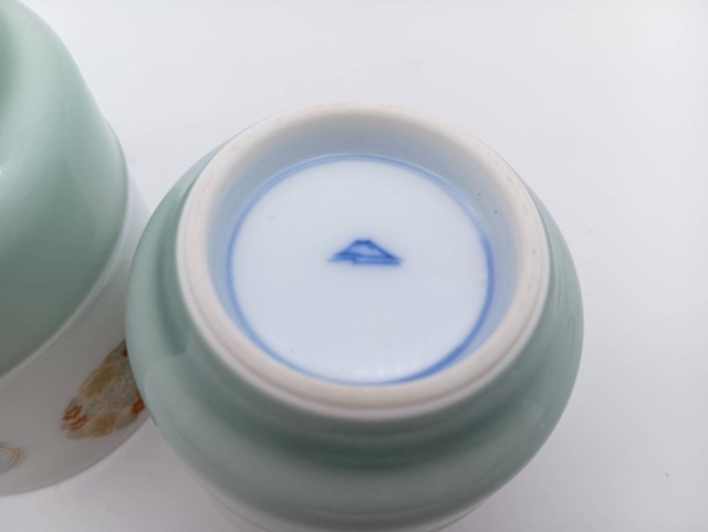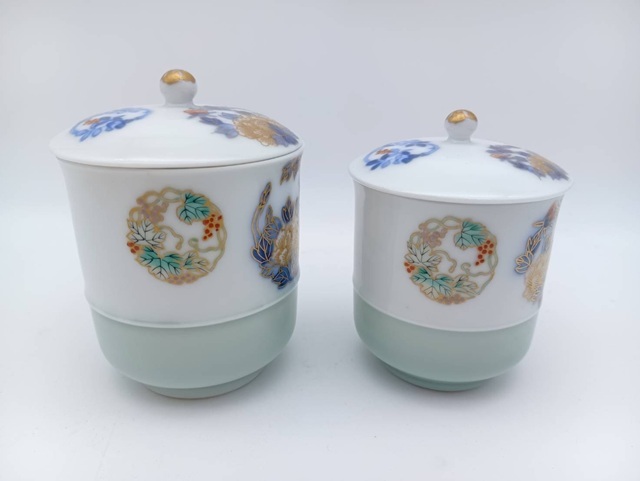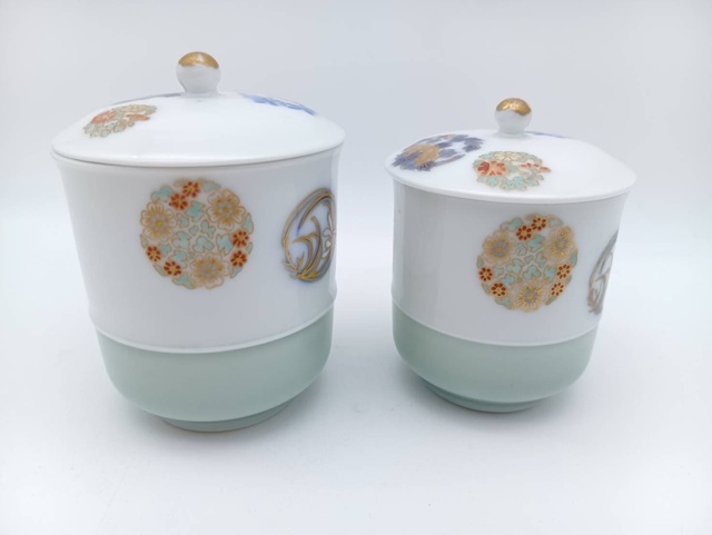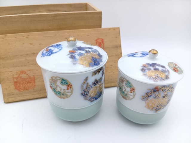 深川製磁 染錦花丸紋 組湯呑 夫婦湯呑 宮内庁御用達 共箱 蓋付き湯呑 茶器 ξ