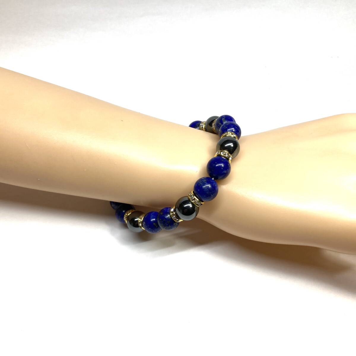 こちらは、ラピスラズリとヘマタイトを組み合わせたパワーストーンブレスレットです。間にはロンデルを挟み高級感あるデザインに仕上げております。石大きさは腕にも馴染みやすいように10mm玉で内径約18cm(伸可能)です。(サイズ変更の場合は取引ナビにてご連絡をお願いします。) 数に限りがございますので気になる方はお早めにどうぞ。