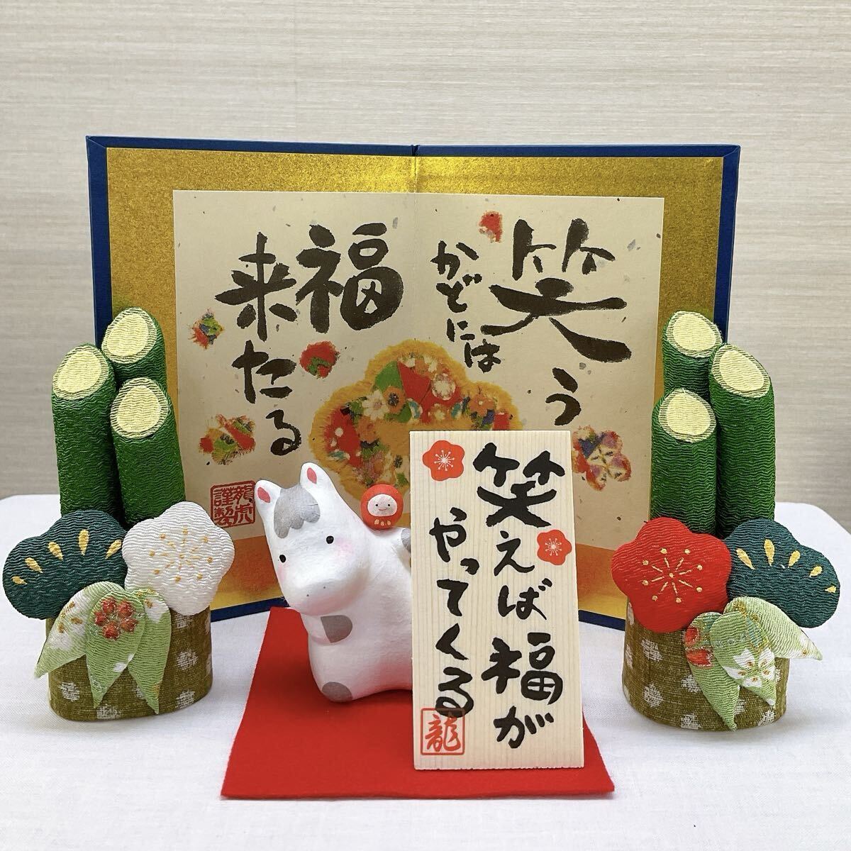 「笑えば福がやってくる」の立札も付いて新年の門出に華やかに彩りを添えてくれます。