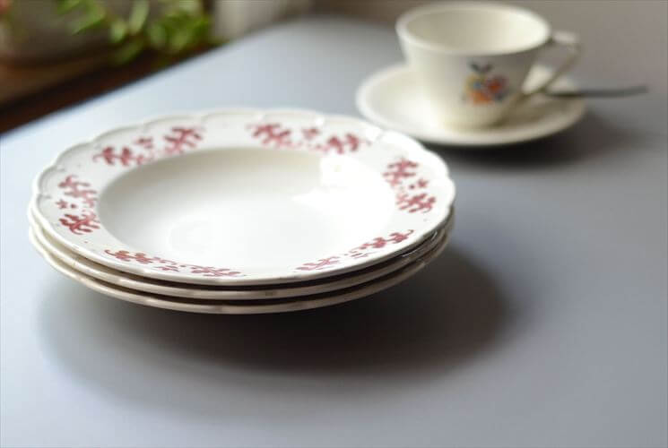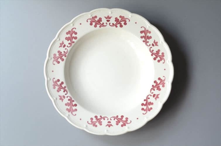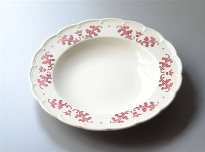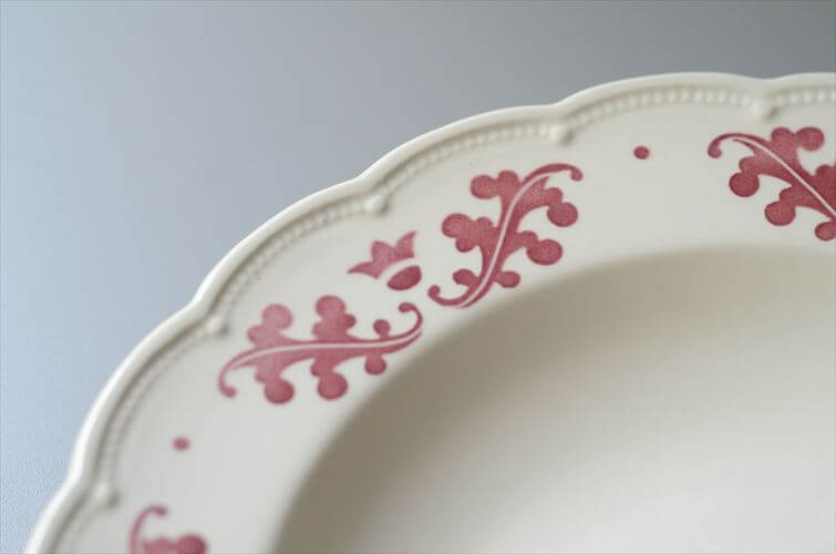 1930-40年代 ベルギー製 BOCH 赤い植物スタンプのスープ パスタプレート 23cm 深皿 アンティーク ヴィンテージ it4072