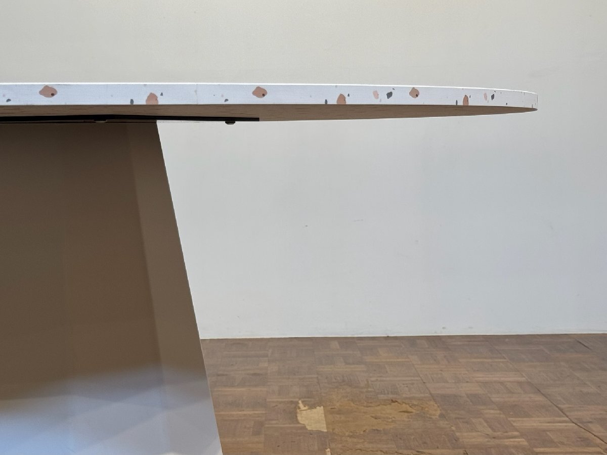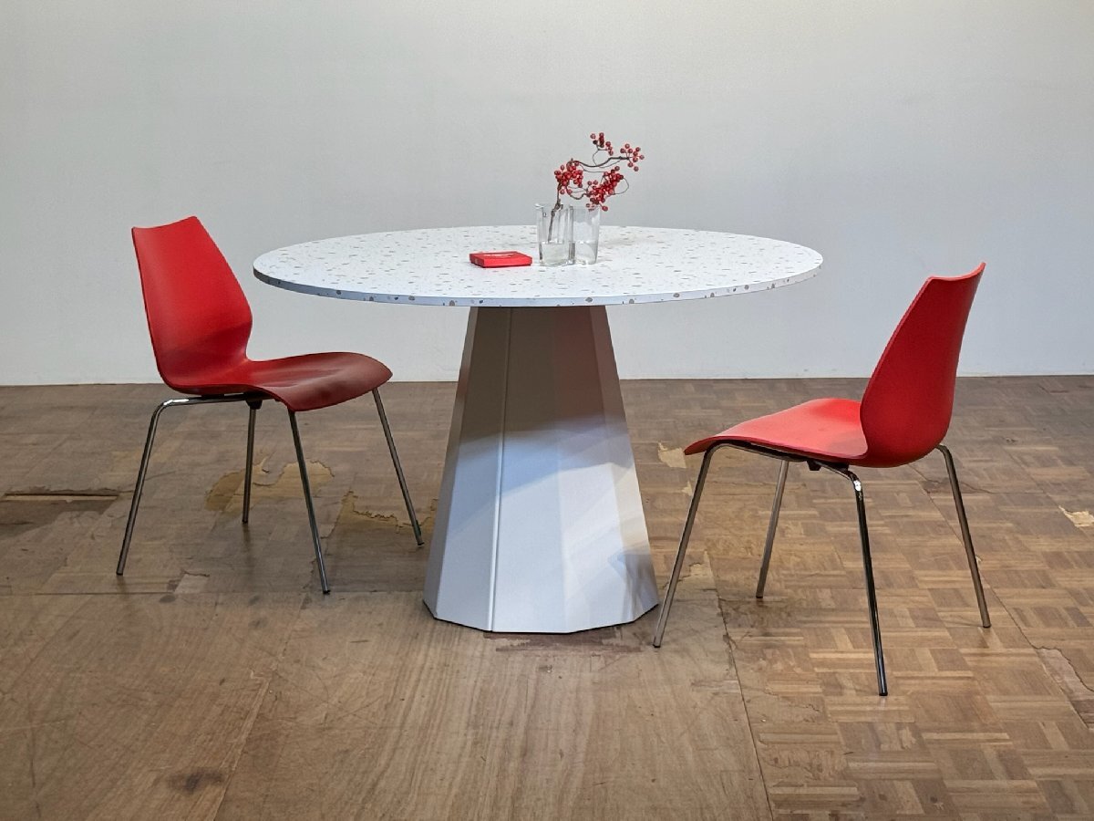 円錐のような10角形状の末広がりをスチール成形で構成したアイキャッチなベースデザインに、無機質な質感で高い人気を誇るイタリアの高級石材「Piasentina stone / ピアゼンティーナストーン」の質感を要したメラミントップで、ニューノルディックデザインとして興隆するオーガニックインダストリアルスタイルを高いユーティリティで実現した名作ラウンドダイニングテーブル。Calligaris より。