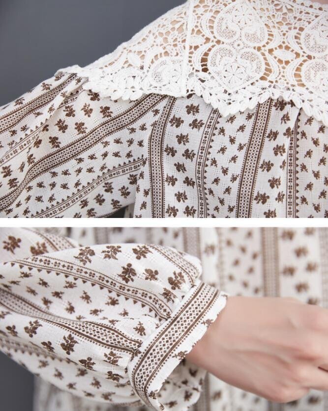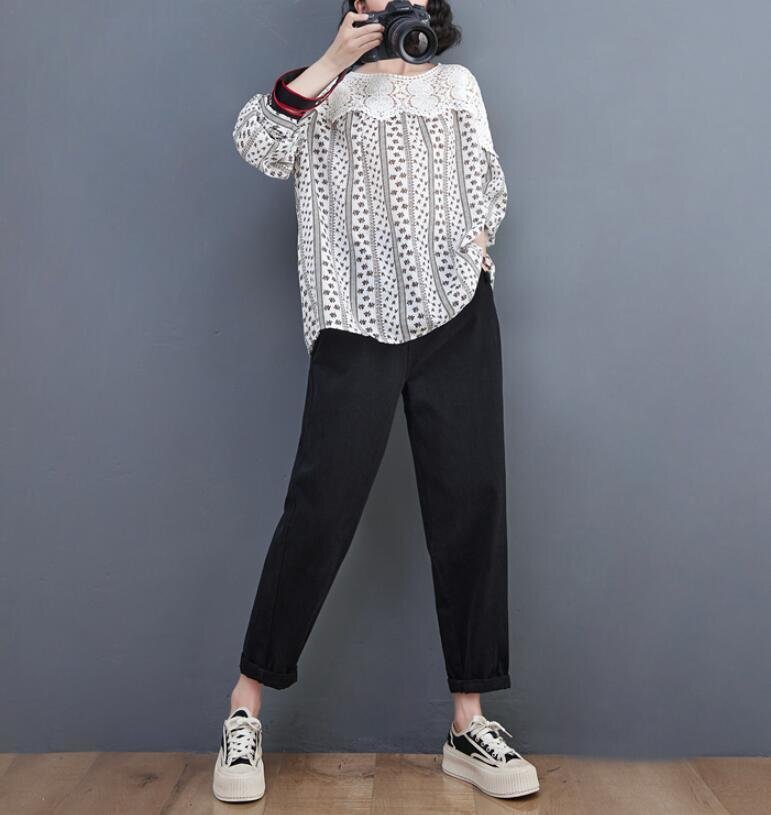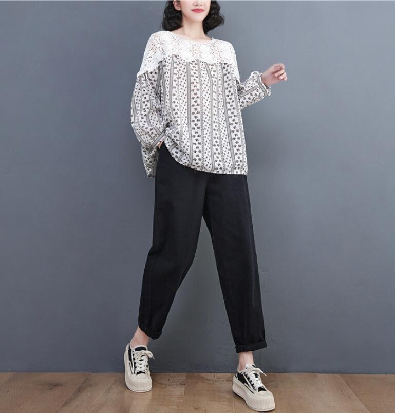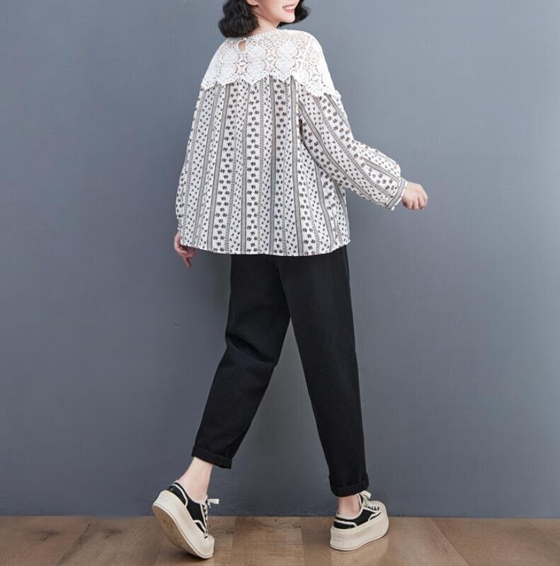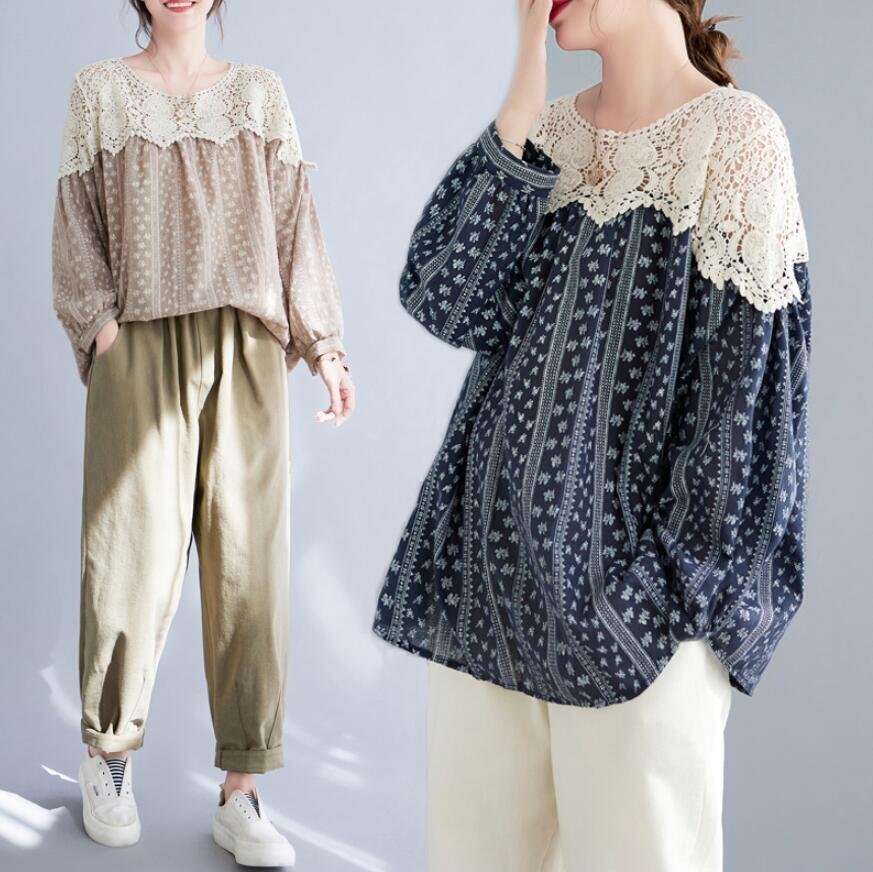 Fサイズ■春新作 カジュアル レース切り替え ブラウス 可愛い大人 プリント柄 長袖トップス 綿麻 チュニック★ベージュ