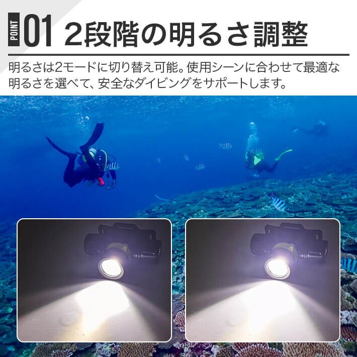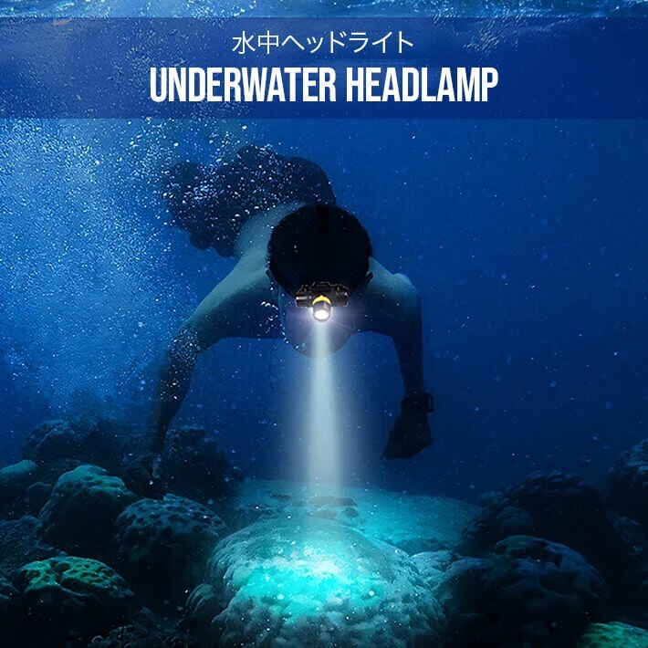 ダイビングヘッドランプ 充電式 XHP70LED 2モード点灯 水中ヘッドライト 1500ルーメン 最大300mまで照らす IPX8防水 角度調整 21700電池付