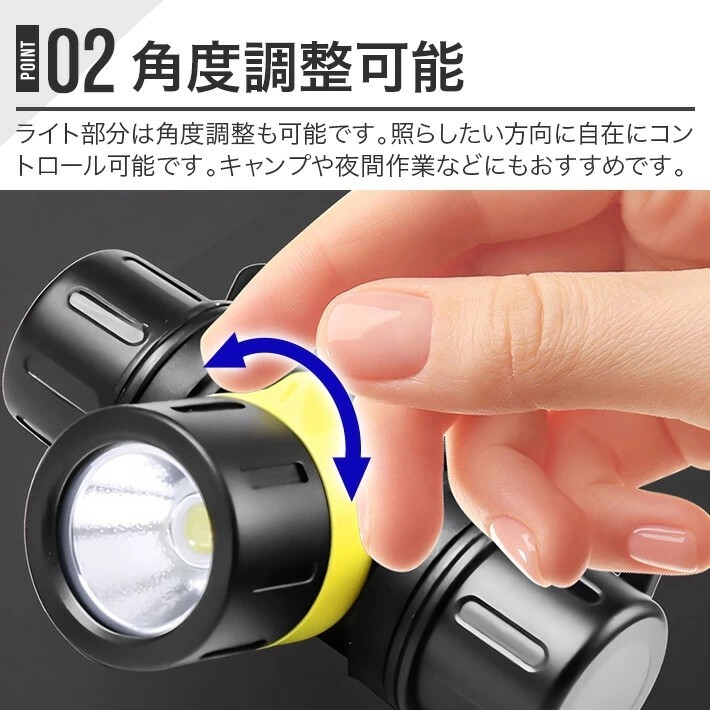 明るさは2段階に切り替え可能で、使用状況に応じて調整できます。ライト部分は角度調整も可能です。