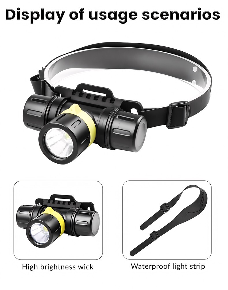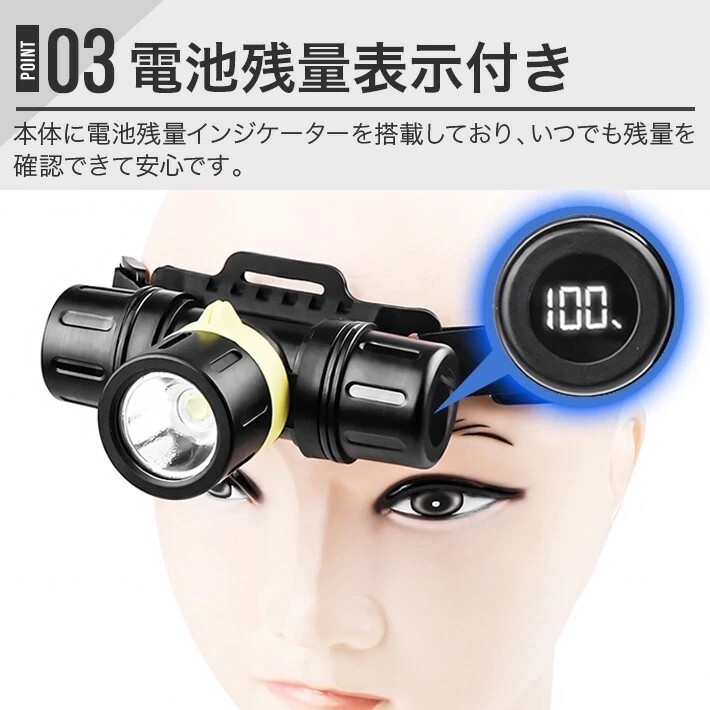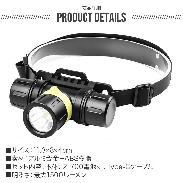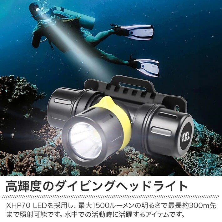 ダイビングヘッドランプ 充電式 XHP70LED 2モード点灯 水中ヘッドライト 1500ルーメン 最大300mまで照らす IPX8防水 角度調整 21700電池付き 登山 屋外作業 電池残量表示 Type-Cケーブル付き 充電式