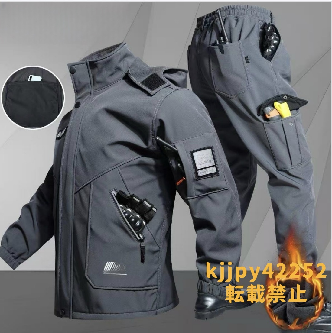 ※ご落札後、ご希望のサイズとカラーをご記入の上、ご送信お願い致します。 商品状態:新品未使用 カラー:画像1 サイズ:S、M、L、XL、2XL、3XL(落札後にお好きなサイズを教えてください) 【サイズ】cm S 胸囲108 着丈66 袖丈55 パンツ丈100 最大ウエスト83 M 胸囲110 着丈68 着丈57 パンツ丈103 最大ウエスト88 L 胸囲114 着丈70 着丈59 パンツ丈106 最大ウエスト92 XL 胸囲118 着丈72 着丈61 パンツ丈107 最大ウエスト96 2XL 胸囲122 着丈74 着丈63 パンツ丈108 最大ウエスト102 3XL 胸囲128 着丈76 着丈65 パンツ丈109 最大ウエスト106 ●素人採寸ですので多少の誤差はお許し下さいませ。 ●実寸は平置実寸。計測の仕方で若干の誤差がありますので参考程度。 1. 用途・シーン: アウトドアや釣りに最適: このジャケットは、防風・防水機能が強化されているため、釣りやハイキング、キャンプなどのアウトドア活動にぴったりです。特に悪天候の中でも快適に過ごせるデザインです。 日常使いにも最適: 日常の外出にも使いやすいです。 2. 防風・防水機能: 防風性能: 冬の強風をしっかり遮断するため、風を通さない素材が使用されています。これにより、寒さから身を守ることができます。 防水性能: 小雨や雪にも対応可能な防水加工が施されており、急な天候の変化にも安心です。 5. 収納ポケット: 多機能ポケット: フロントに複数のポケットがあり、必要な小物(スマホや手袋など)を収納できる便利な設計です。 6. 汎用性: 幅広いアクティビティに対応: 釣り以外にも、アウトドア全般、通勤・通学、旅行など幅広いシーンで活躍するアイテムです。 4. フード付きデザイン: フード付き: フード部分は調整可能で、風や雨を防ぐために役立ちます。また、フードが取り外し可能なデザインも多く、シーンに応じてスタイルを変えることができます。