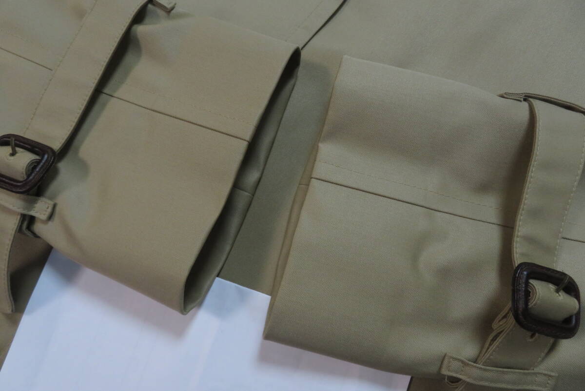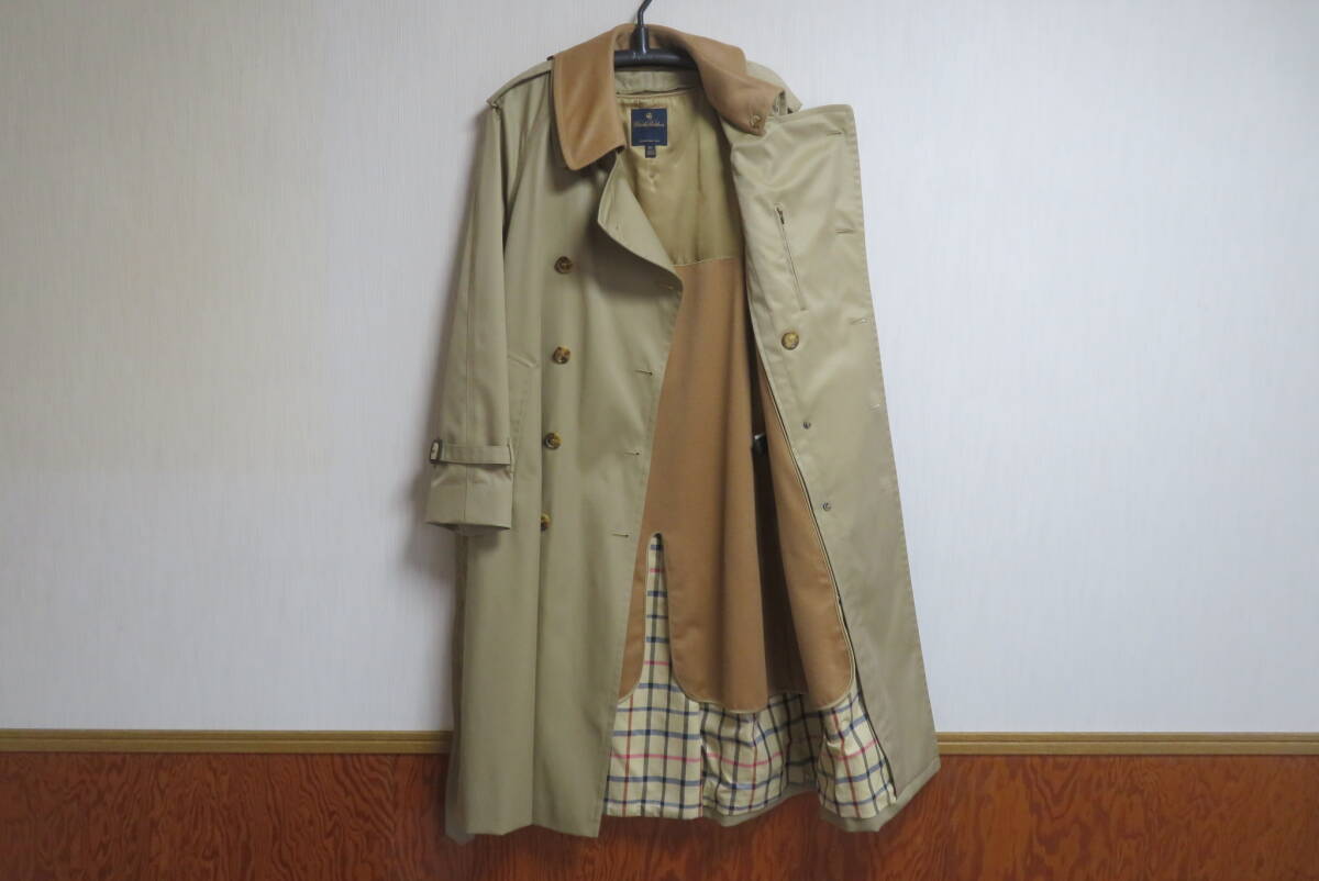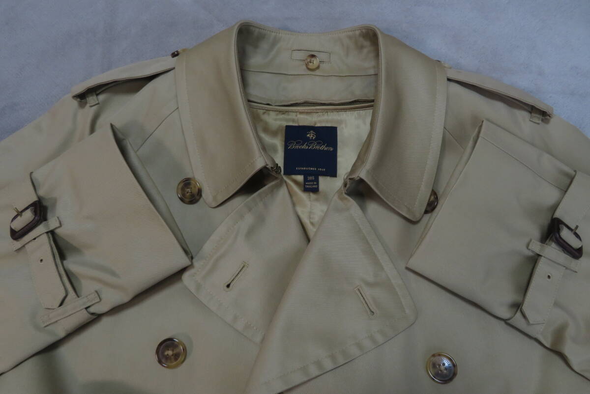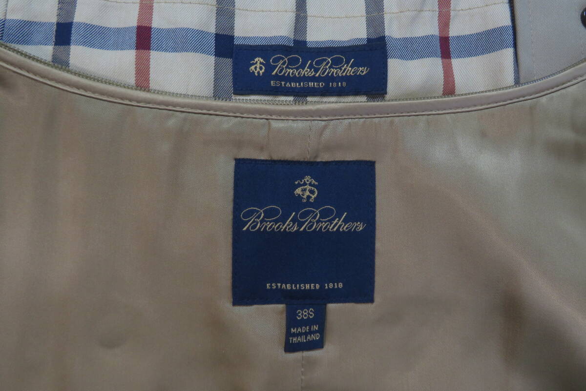 ★ブルックスブラザーズ・Brooks Brothers★ライナー付 トレンチコート【未使用品】size38S の出品です。 下げ札や値札はありませんがこちらは未使用品で、汚れや傷みも無く新品に近いとてもきれいなお品です。◆未使用のきれいなお品ですが、人の手に渡り試着などはされており個人が保管していたものなので新品ではなく中古品として出品させていただきます。目の詰んだ張りのあるコツトンギャバジンで仕立てたトラッドなスタイルのトレンチコートで、カシミヤをブレンドした滑らかな肌触りの脱着式のキャメルカラーのライナーと襟カバーを装着したスリーシーズンご愛用いただけるお洒落なコートです。本格的な作りのトレンチコートながら、こちらは襟元のチンストラップや肩口のストームフラップを省いた少しソフトなイメージのスタイルで、トラッドな着こなしからビジネスシーンまでお洒落に着て頂けます。張り感のある目の詰んだコットンギャバジンを使い少し玉虫調の光沢がある高級感のある色合いに、タッターソール柄の裏地やBrooksのロゴを刻んだ水牛角のボタンなど、ブルックスならではの洗練されたお洒落な仕上りです。ブルックスの正規ショップで購入すれば十数万円はするトレンチコートです、探していた方はサイズが合えばお得だと思いますのでお奨めいたします。◆欧米サイズの表記になっておりますので、お手持ちの服のサイズや(実寸)を参考にしてください。 表示サイズ 38 S 日本の L相当 (実寸) 着丈116、身幅57、裄丈86(ラグランスリーブなので首の中心より袖先まで)、袖丈46(脇の付け根より袖先) ベルトの全長166 表地:綿100% 裏地:綿100% 袖裏:キュプラ100% ライナー:毛70%×カシミヤ30% 襟カバー:毛70%×カシミヤ30% 表の色:カーキ ライナーの色:キャメル (株)ブルックスブラザーズジャパン正規品 タイ製