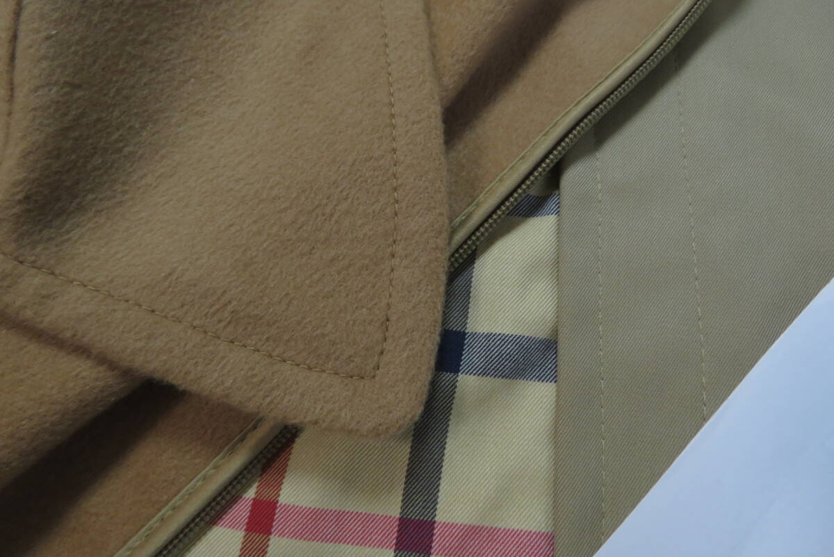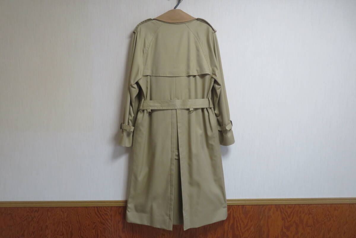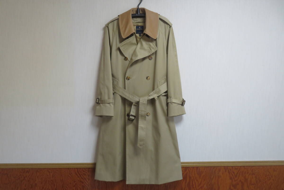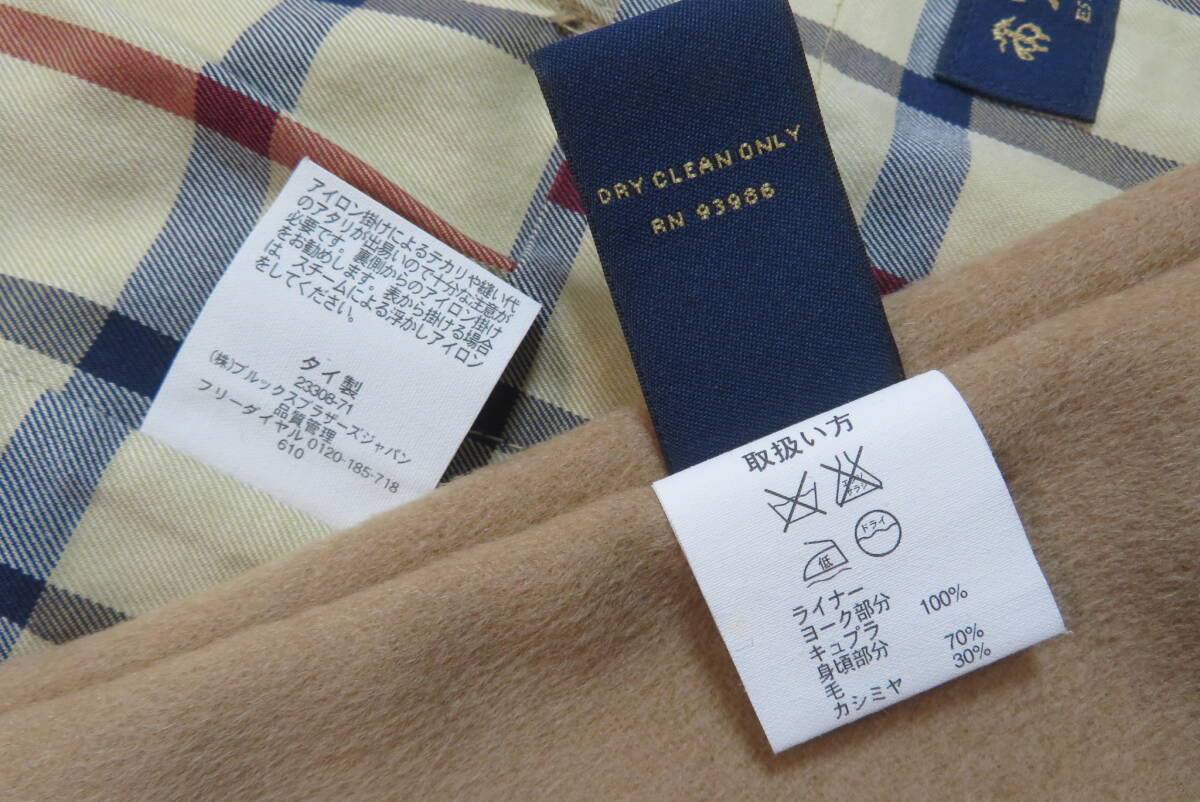 ★ブルックスブラザーズ・Brooks Brothers★ライナー付 トレンチコート【未使用品】size38S の出品です。 下げ札や値札はありませんがこちらは未使用品で、汚れや傷みも無く新品に近いとてもきれいなお品です。◆未使用のきれいなお品ですが、人の手に渡り試着などはされており個人が保管していたものなので新品ではなく中古品として出品させていただきます。目の詰んだ張りのあるコツトンギャバジンで仕立てたトラッドなスタイルのトレンチコートで、カシミヤをブレンドした滑らかな肌触りの脱着式のキャメルカラーのライナーと襟カバーを装着したスリーシーズンご愛用いただけるお洒落なコートです。本格的な作りのトレンチコートながら、こちらは襟元のチンストラップや肩口のストームフラップを省いた少しソフトなイメージのスタイルで、トラッドな着こなしからビジネスシーンまでお洒落に着て頂けます。張り感のある目の詰んだコットンギャバジンを使い少し玉虫調の光沢がある高級感のある色合いに、タッターソール柄の裏地やBrooksのロゴを刻んだ水牛角のボタンなど、ブルックスならではの洗練されたお洒落な仕上りです。ブルックスの正規ショップで購入すれば十数万円はするトレンチコートです、探していた方はサイズが合えばお得だと思いますのでお奨めいたします。◆欧米サイズの表記になっておりますので、お手持ちの服のサイズや(実寸)を参考にしてください。 表示サイズ 38 S 日本の L相当 (実寸) 着丈116、身幅57、裄丈86(ラグランスリーブなので首の中心より袖先まで)、袖丈46(脇の付け根より袖先) ベルトの全長166 表地:綿100% 裏地:綿100% 袖裏:キュプラ100% ライナー:毛70%×カシミヤ30% 襟カバー:毛70%×カシミヤ30% 表の色:カーキ ライナーの色:キャメル (株)ブルックスブラザーズジャパン正規品 タイ製