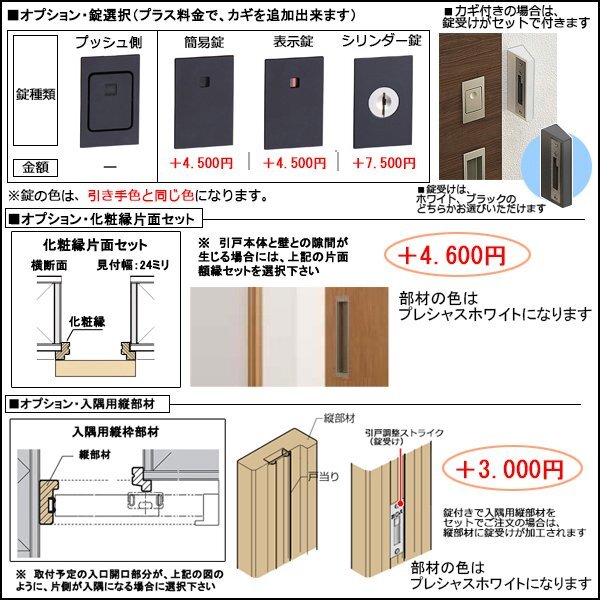 | 商品紹介 | ○ トステム (LIXIL) の室内建具 アウトセット片引戸 ラシッサD Palette ○ デザインP-LAH ○ ダブルソフトモーション標準装備 ○ ノンケーシング * 色をお選び頂けます * 引手色をお選び頂けます * 引込勝手をお選び頂けます * オプション・錠を追加できます。(シリンダー錠はカギが3本セットで付きます) * オプション・片面化粧額縁セットを追加できます。 * オプション・入隅用縦部材を追加できます。 * オプション・バーハンドル(片側)に変更できます。 * 同時に複数セット、お買上げ頂けますと、送料の値引を致します。 違うサイズ(違う種類)との組合せでもOKです、是非お問合せ下さい。 |
