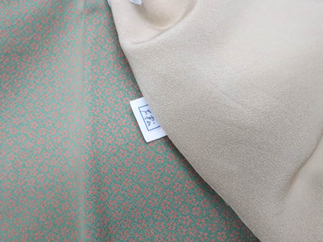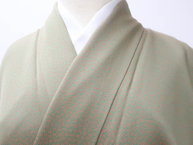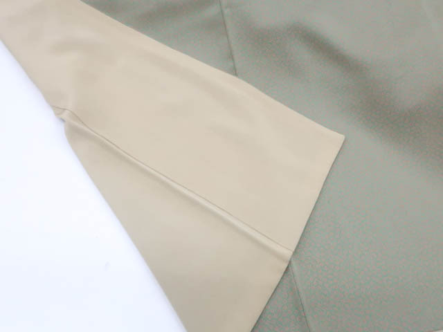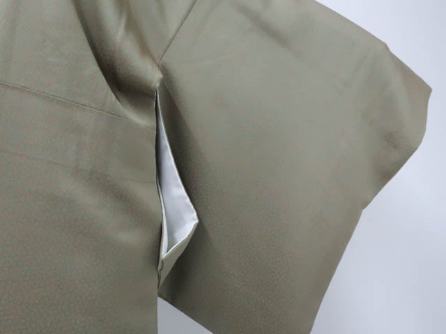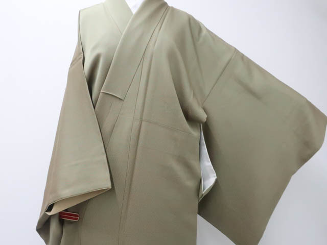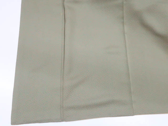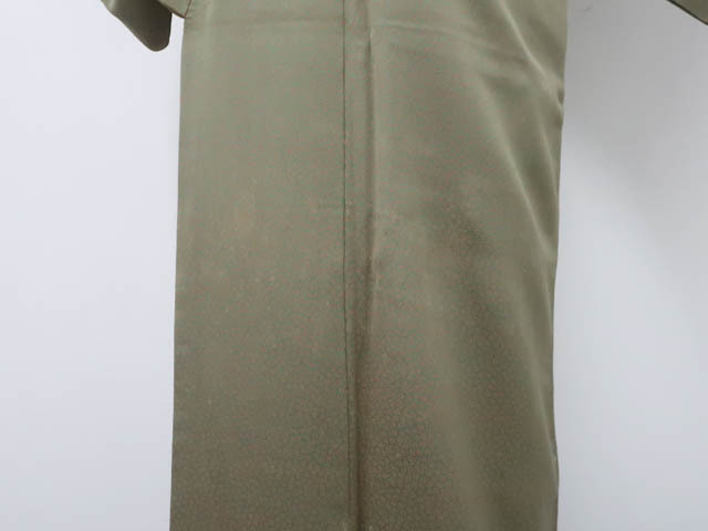 リサイクル商品のため、全体所々にしみ汚れと、タグに記名がございますが着用可能なお品です。 地色は くすみ緑です。 1枚目の画像が近いお色かと思われます。 素材は正絹です。 |