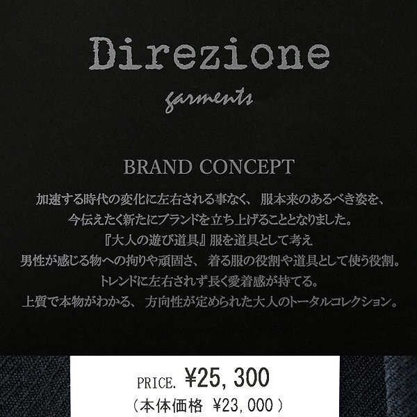 【Direzione(ディレツィオーネ)】 加速する時代の変化に左右される事なく、服本来のあるべき姿を、今伝えたく新たにブランドを立ち上げることとなりました。 『大人の遊び道具』服を道具としてと考え男性が感じる物への拘りや頑固さ、着る服の役割や道具として使う役割。トレンドに左右されず長く愛着感が持てる。 上質で本物が分かる、方向性が定められた大人のトータルコレクション。 ・杢感のあるウールライクジャージー素材を使用した、ロングシーズンジャケットです。 ・秋口~春先まで着られる程よい厚みの生地感で、くっきりとしたカルゼの綾目が特徴的。 ・高ストレッチ性とゆったりめシルエットにより、リラックスできる着心地に仕上がっています。 ・ベーシックなテーラードデザインが、ビジネスにもきれいめカジュアルにもピッタリ。 ・家庭用洗濯機で洗うことができ、イージーケアで経済性が良いのも嬉しいポイントです。 ・シワになりにくい素材なので、旅行や出張などのお供にも重宝する一着です。 【デザイン】 ・アンコン仕立て ・フロントは2つボタン ・センターベント ・袖先は3つボタン |