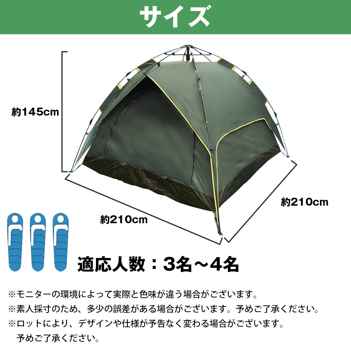 簡単組み立て! 2WAY ワンタッチ式 ドーム型 テント 3人から4人用! キャンプ アウトドア ワンタッチテント ドームテント グリーン 緑 簡易
