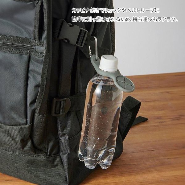 | ペットボトルやタオルを差し込み、 カラビナでリュックなどに付けられます。 | |