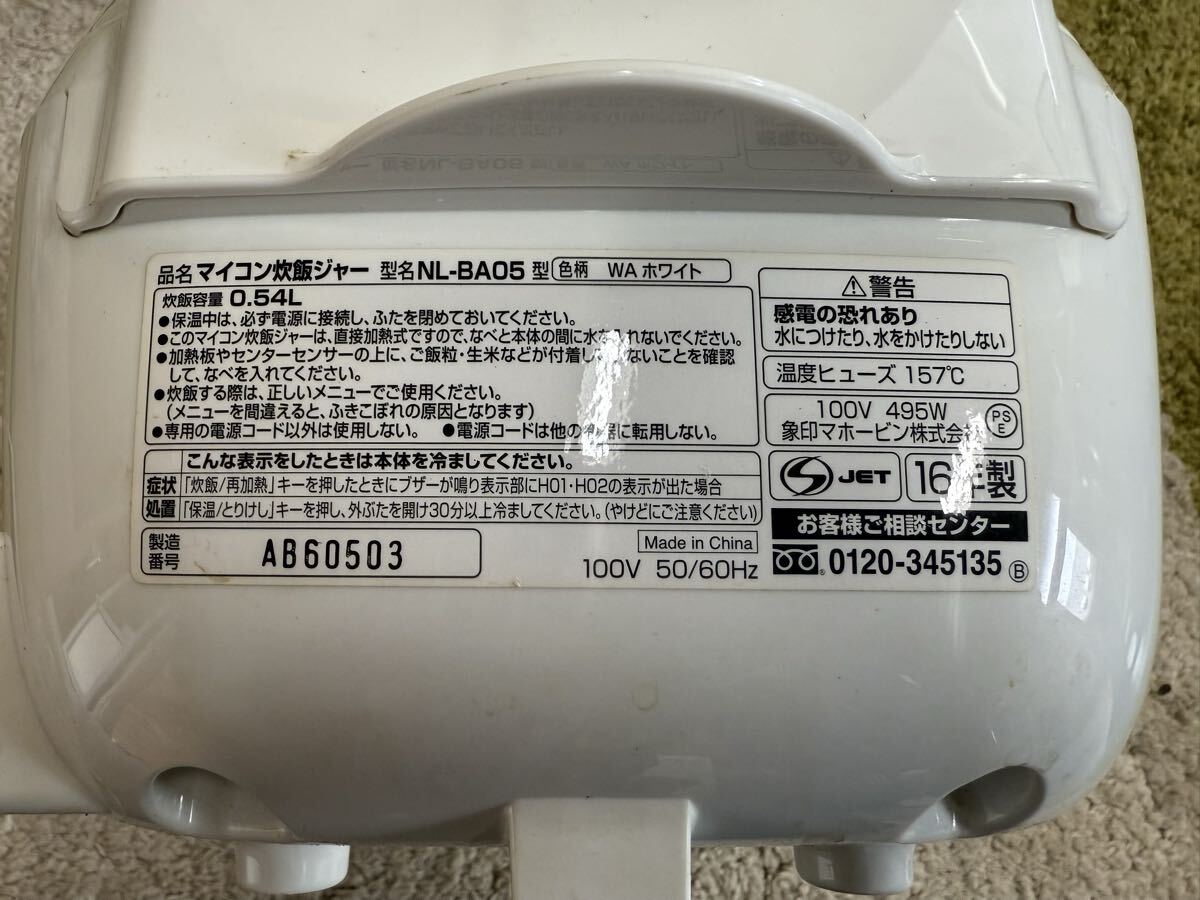 象印 ZOJIRUSHI のマイコン炊飯ジャー NL-BA05(3合炊き/ホワイト)です。コンパクトサイズで一人暮らしや少人数世帯向けの炊飯器として使われていたお品です。