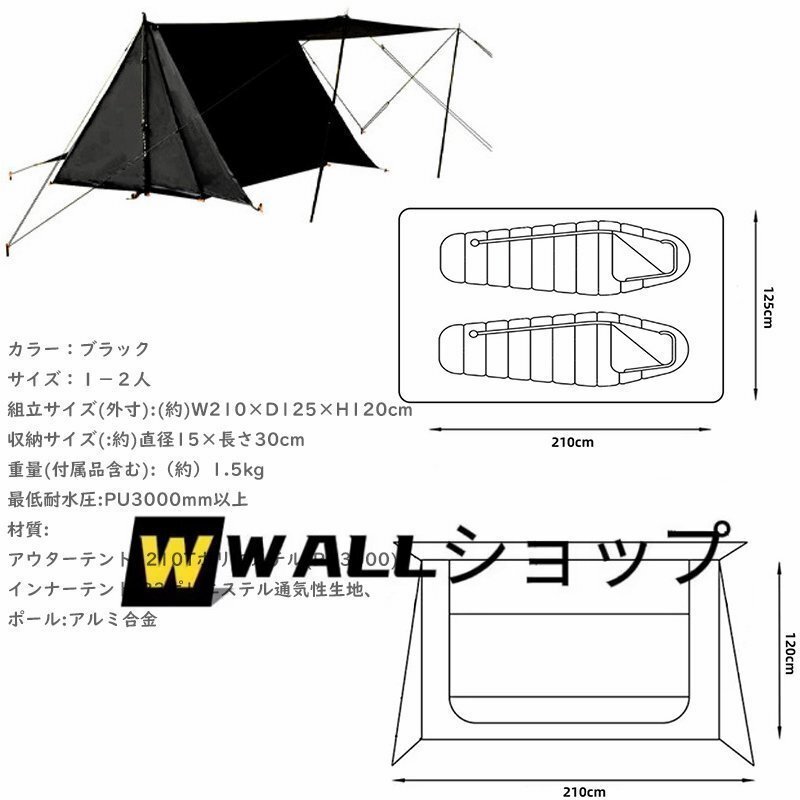 テント 1-2人用 広い前室 ツーリング コンパクト BCポリコットン素材 軽量 通気 簡単設営 キャンプ アウトドア 撥水 マット付き ブラック