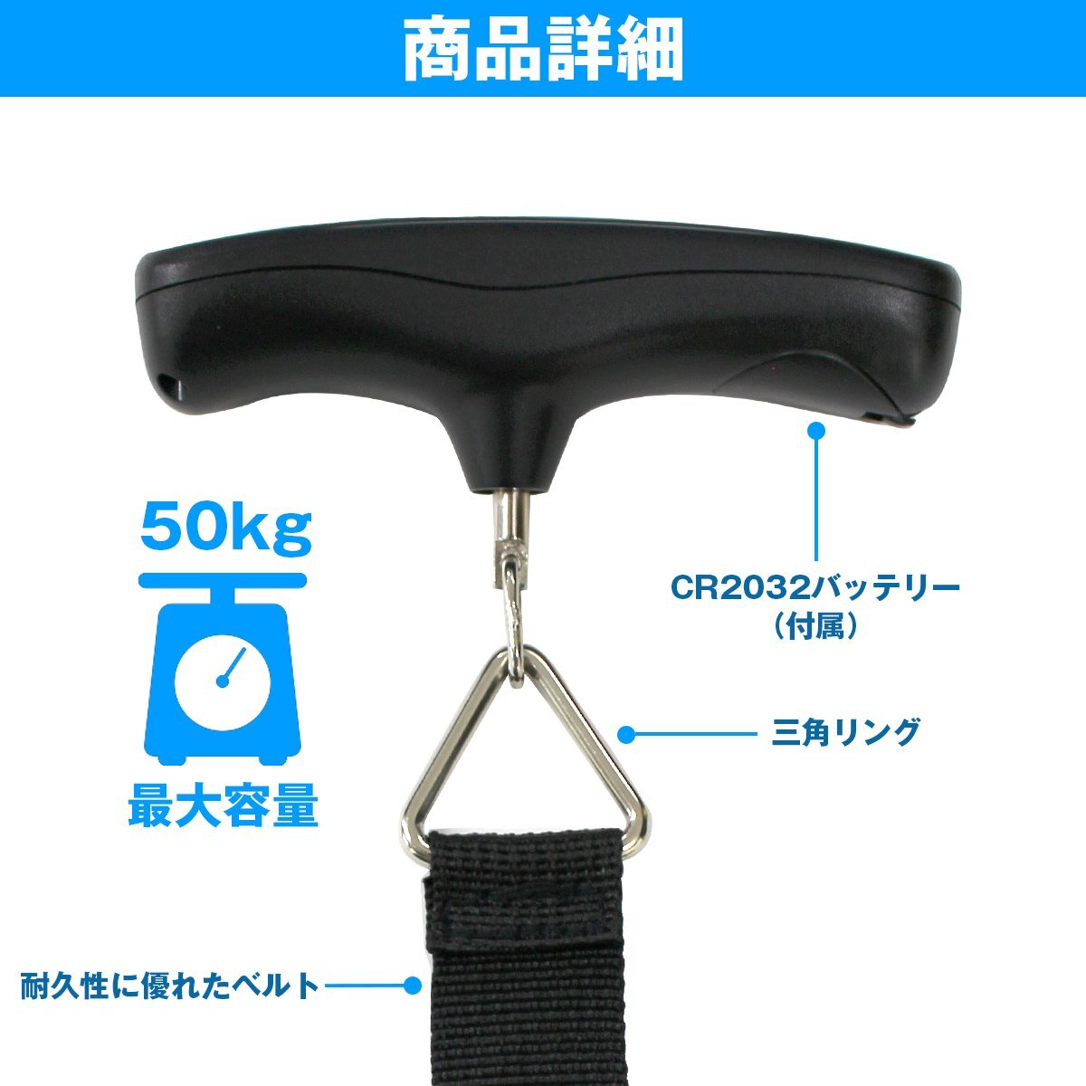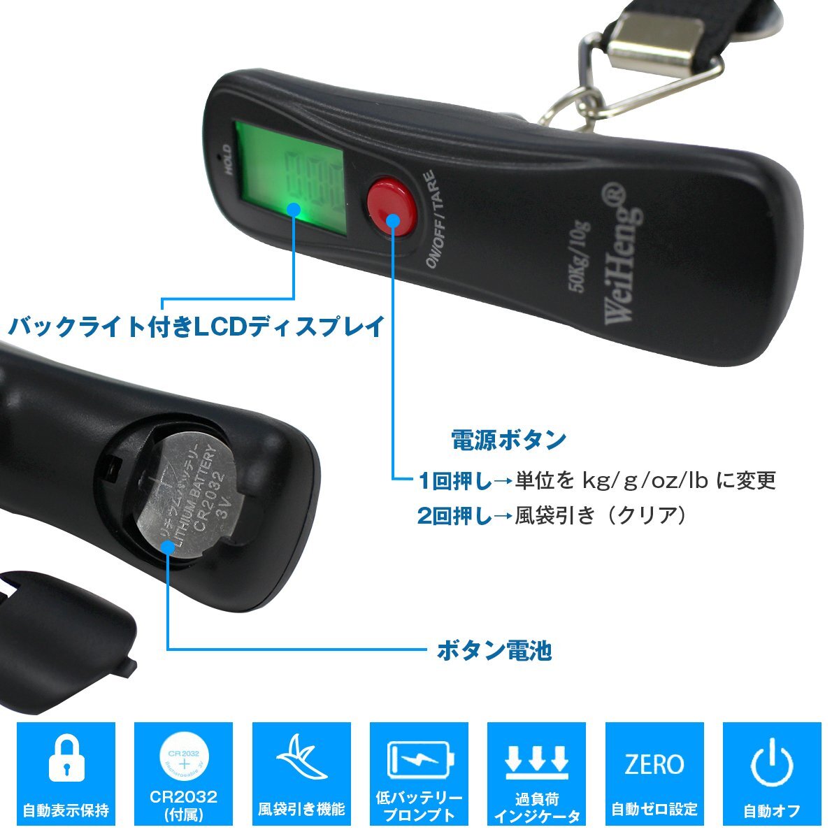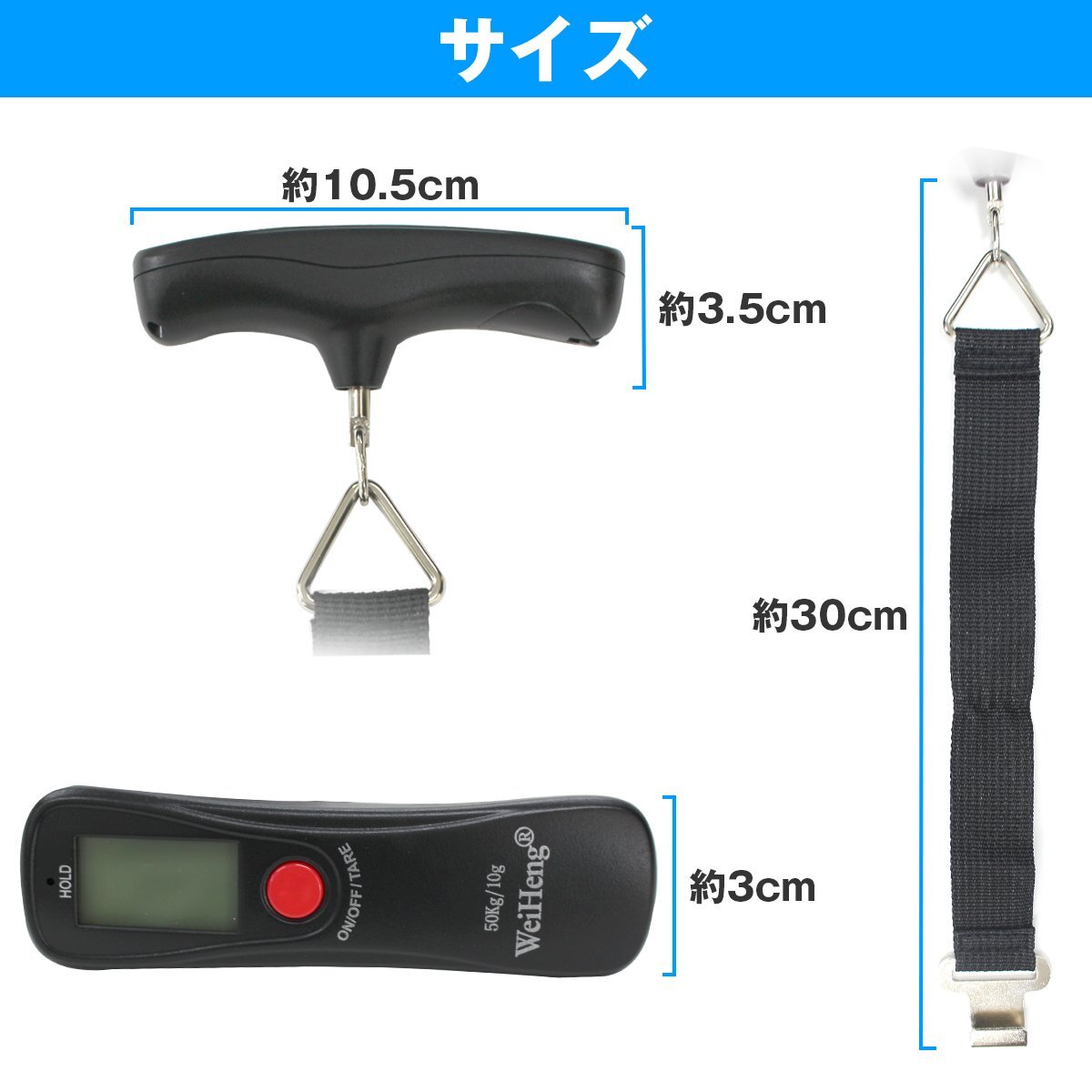 商 品 説 明■荷物の重さを手軽に量る、携帯式デジタルスケール。