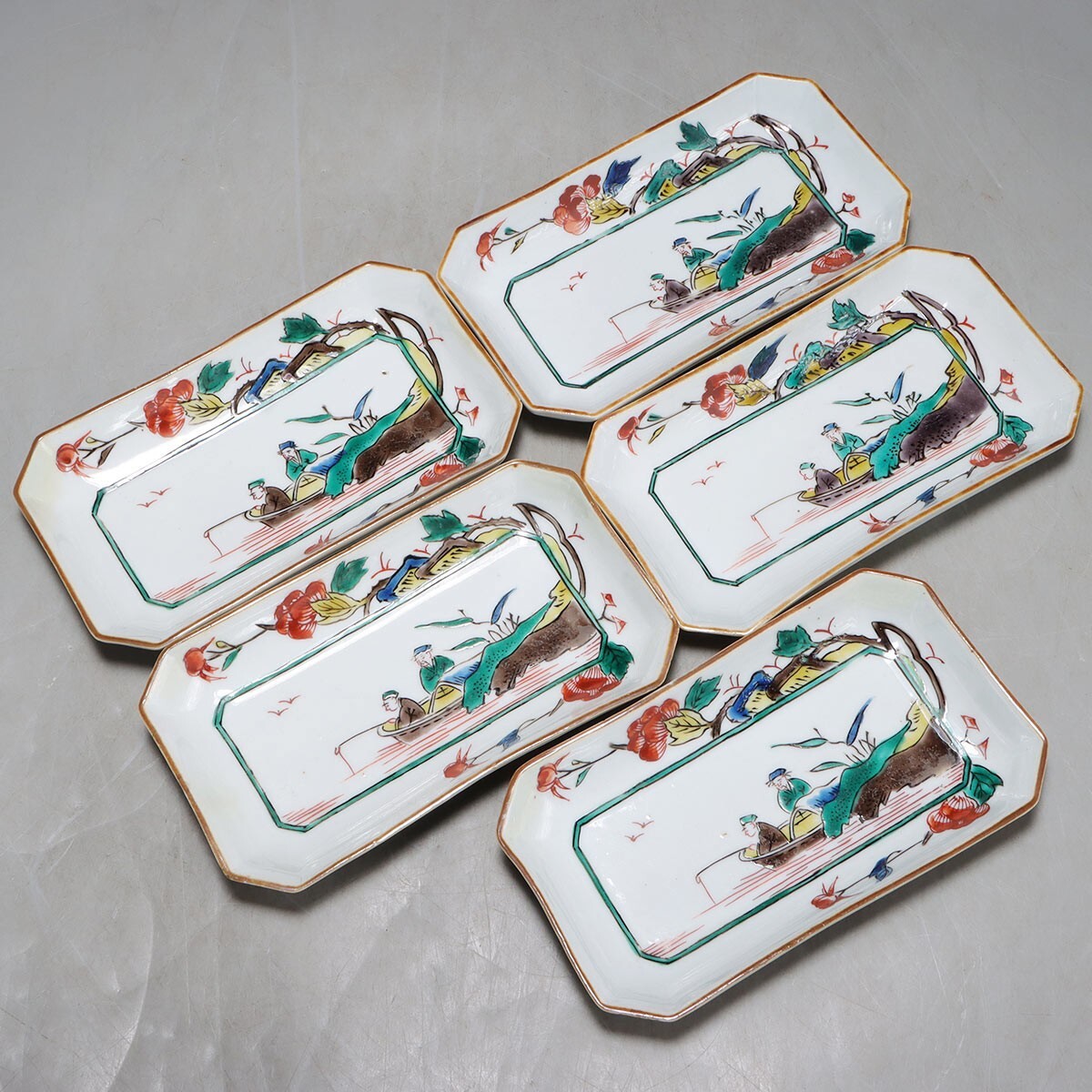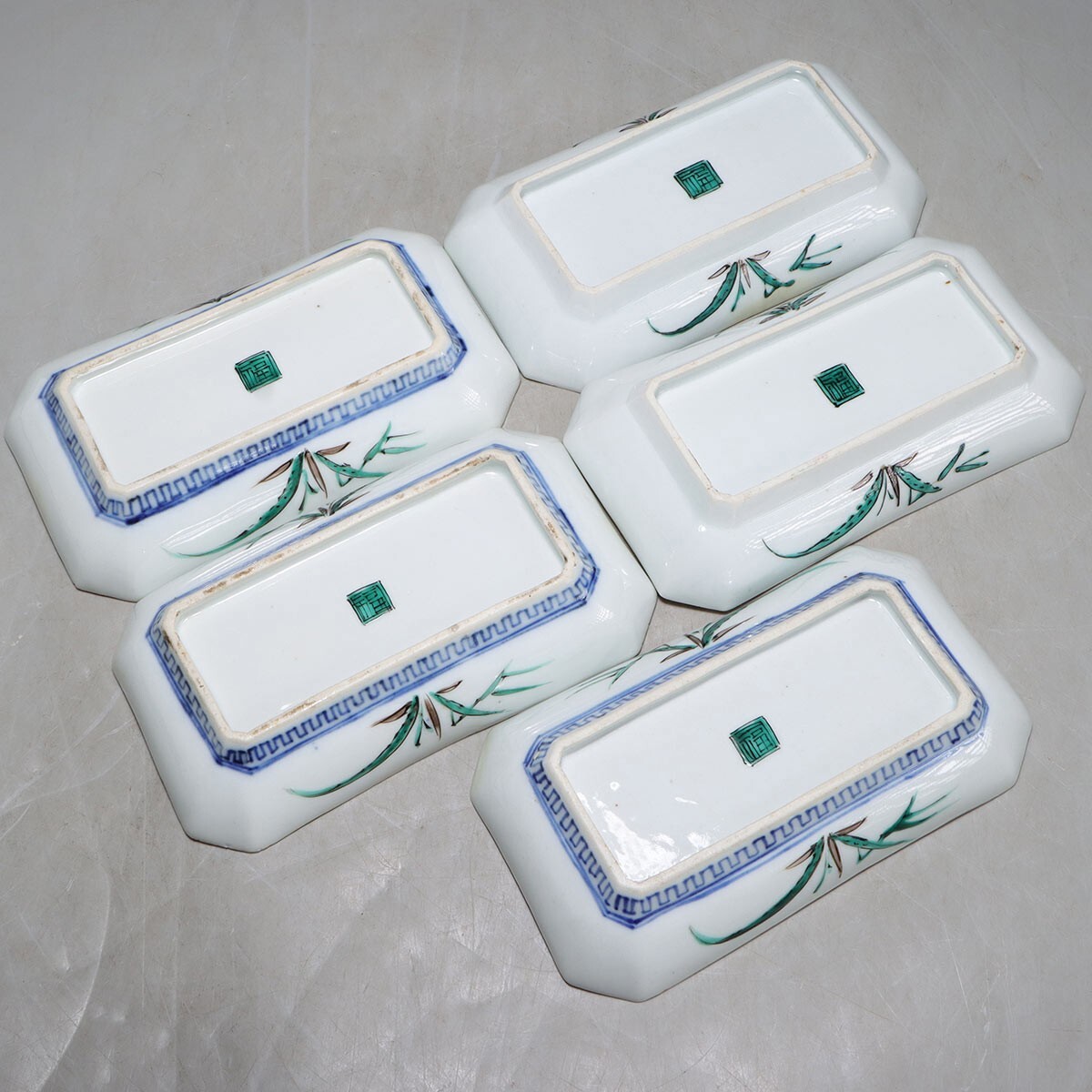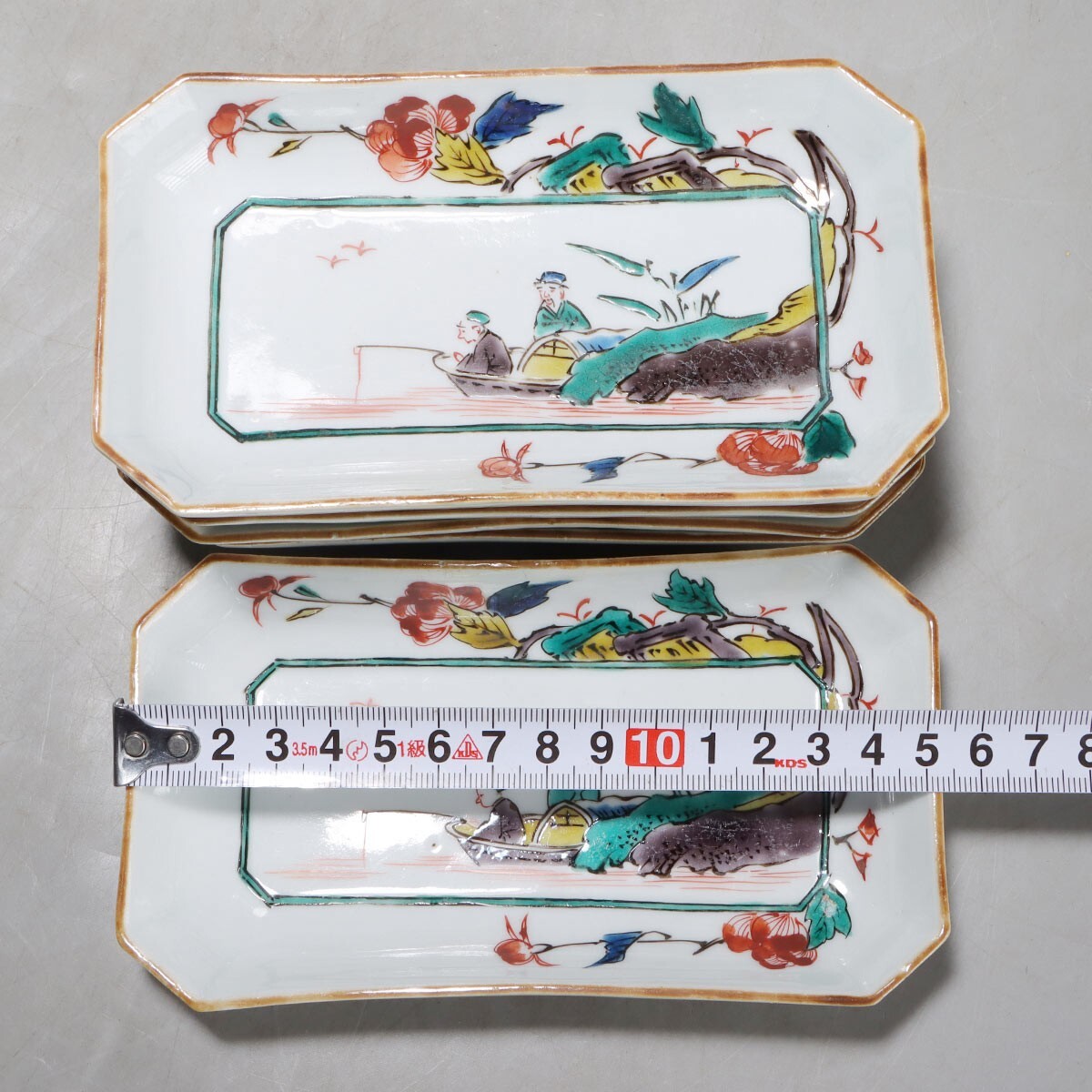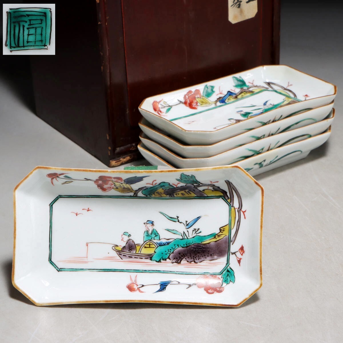 ご覧いただきありがとうございます。 古美術 古九谷 角福銘 魚釣人舟風景図長皿 五客 合箱の出品です。