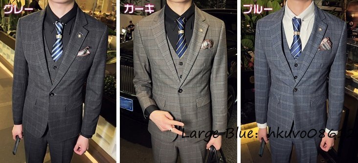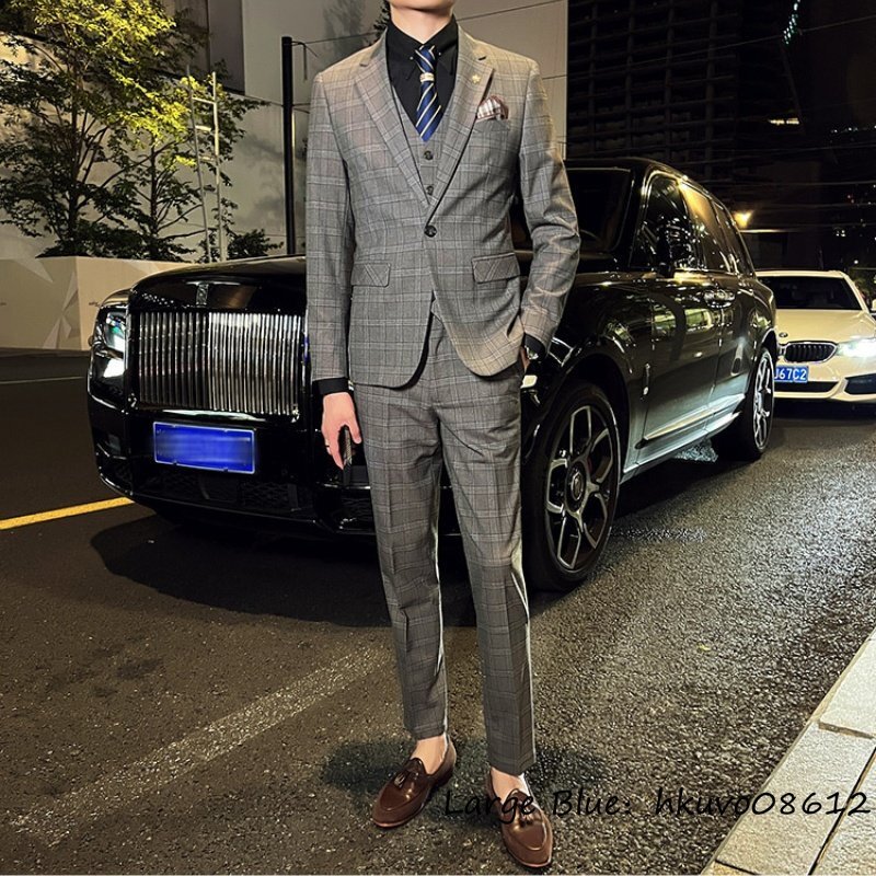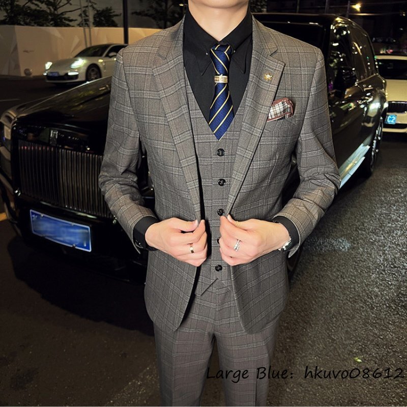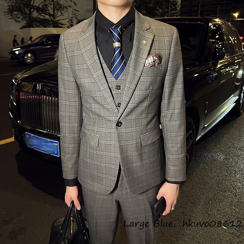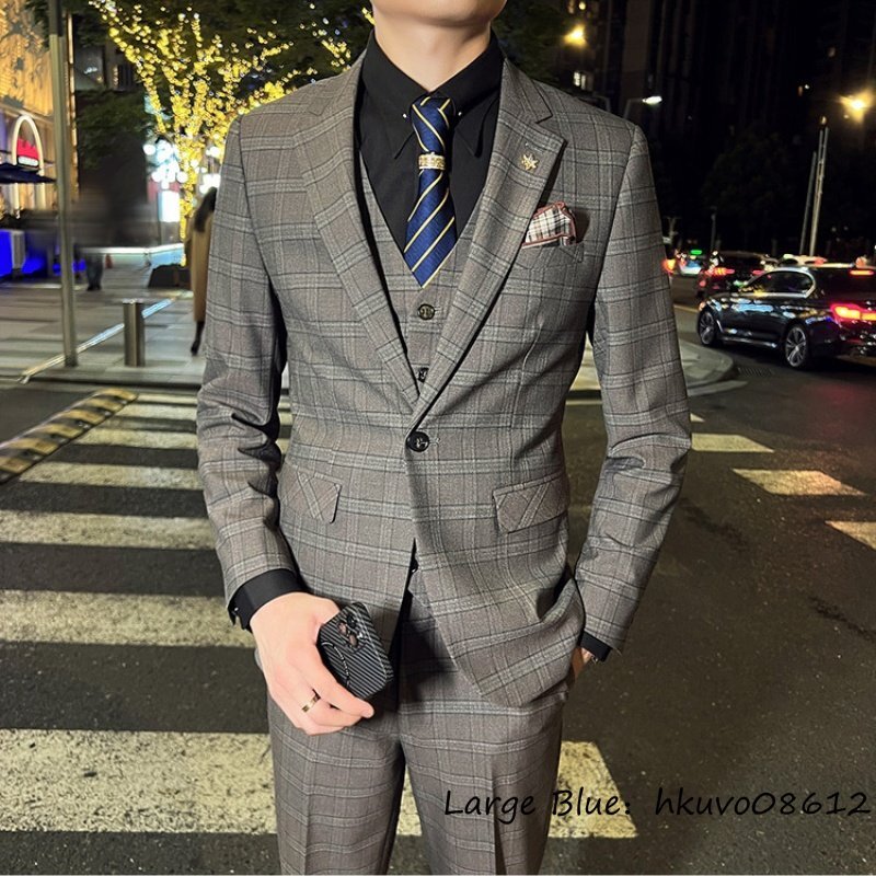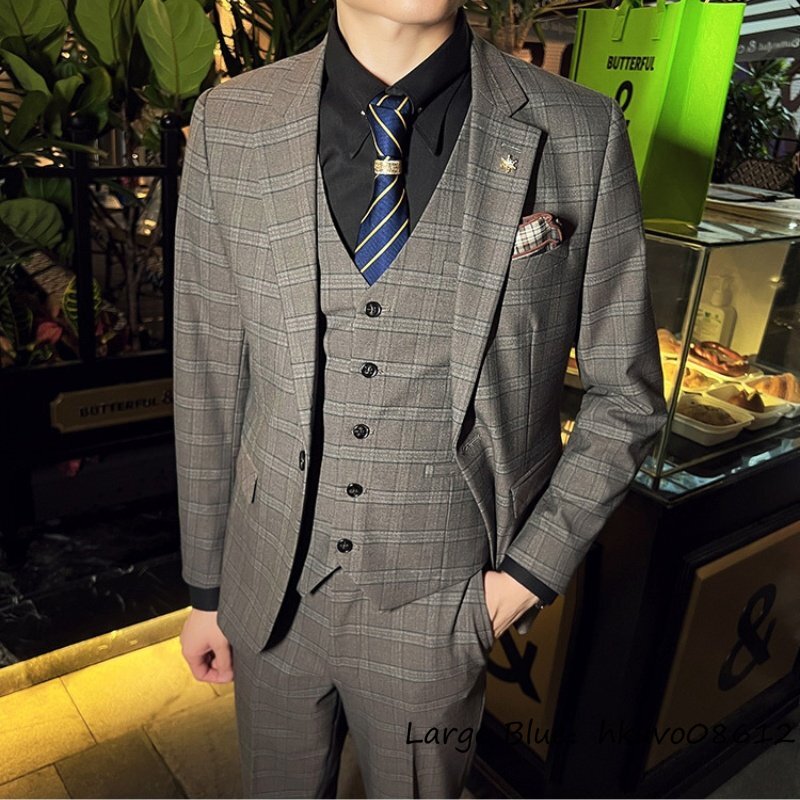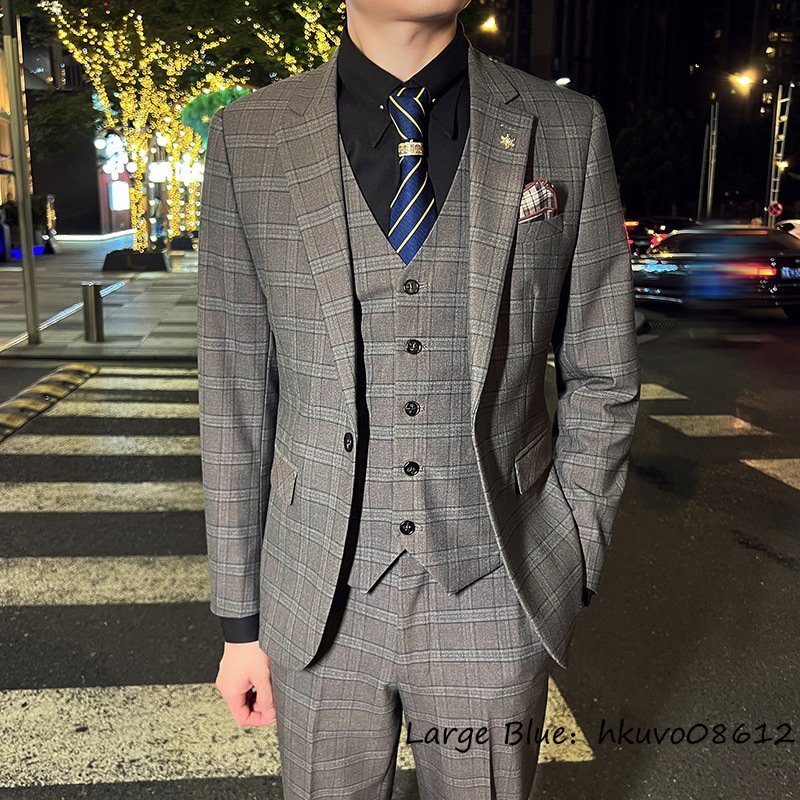 定価6万■新品 スーツセット ビジネススーツ メンズ チェック柄 スリーピース 一つボタンシングルスーツ 三点セット フォーマル カーキ 2XL