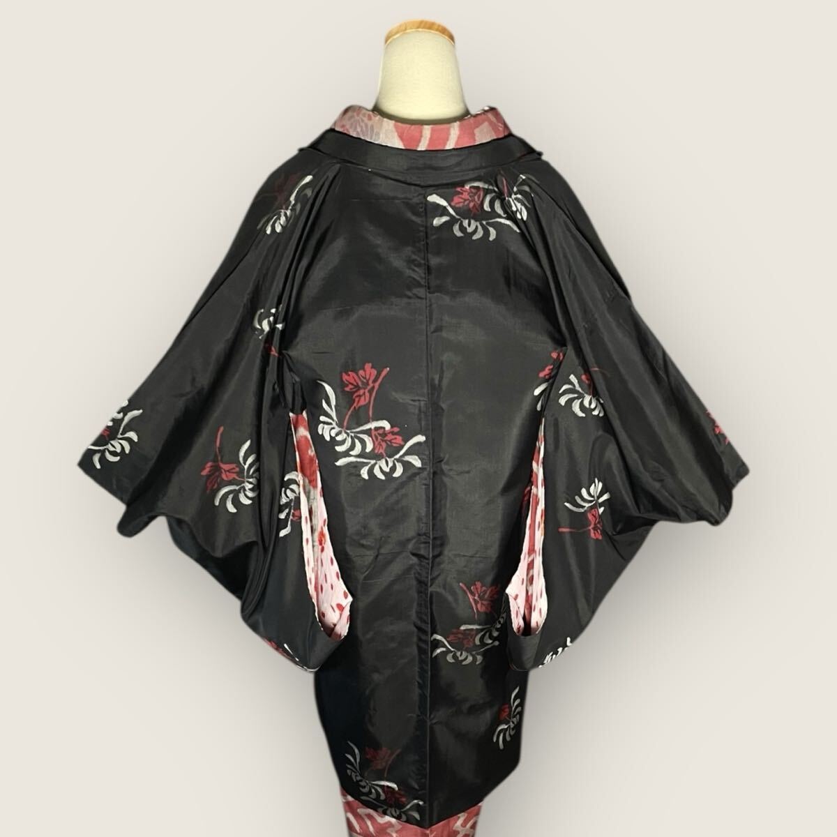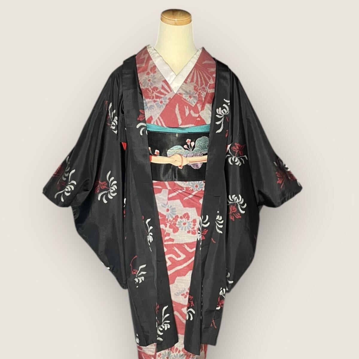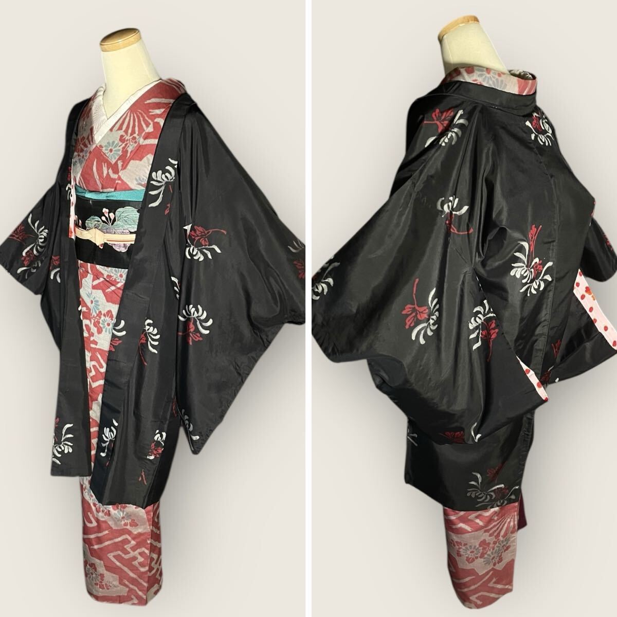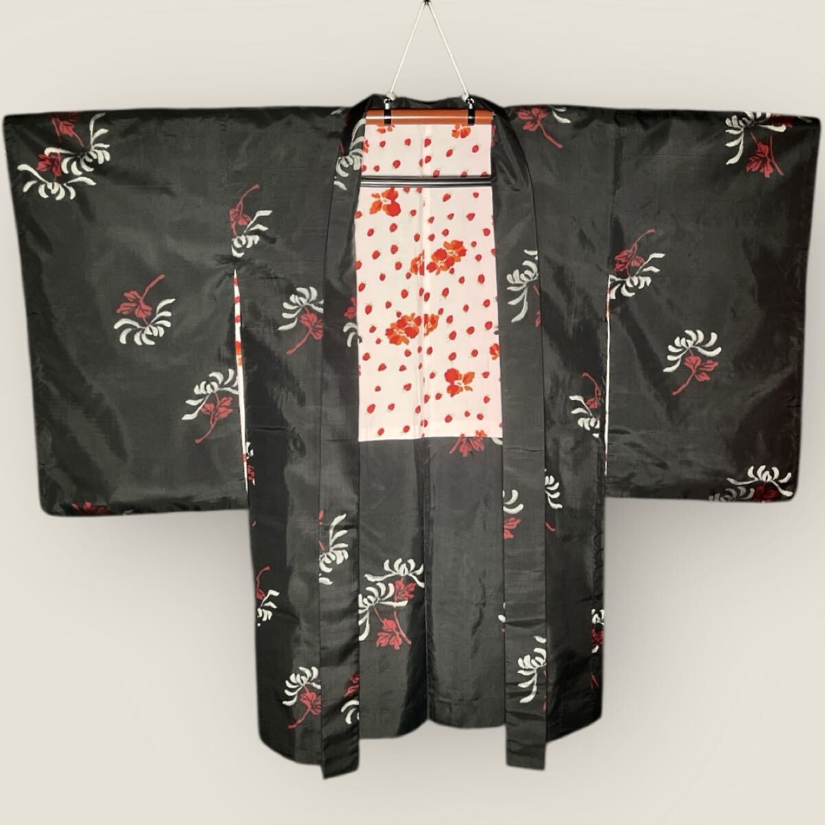 黒地に赤い茎(!)の白菊の飛び柄が不思議な哀愁漂うアンティーク長羽織。羽裏はとっても乙女ないちご柄です。