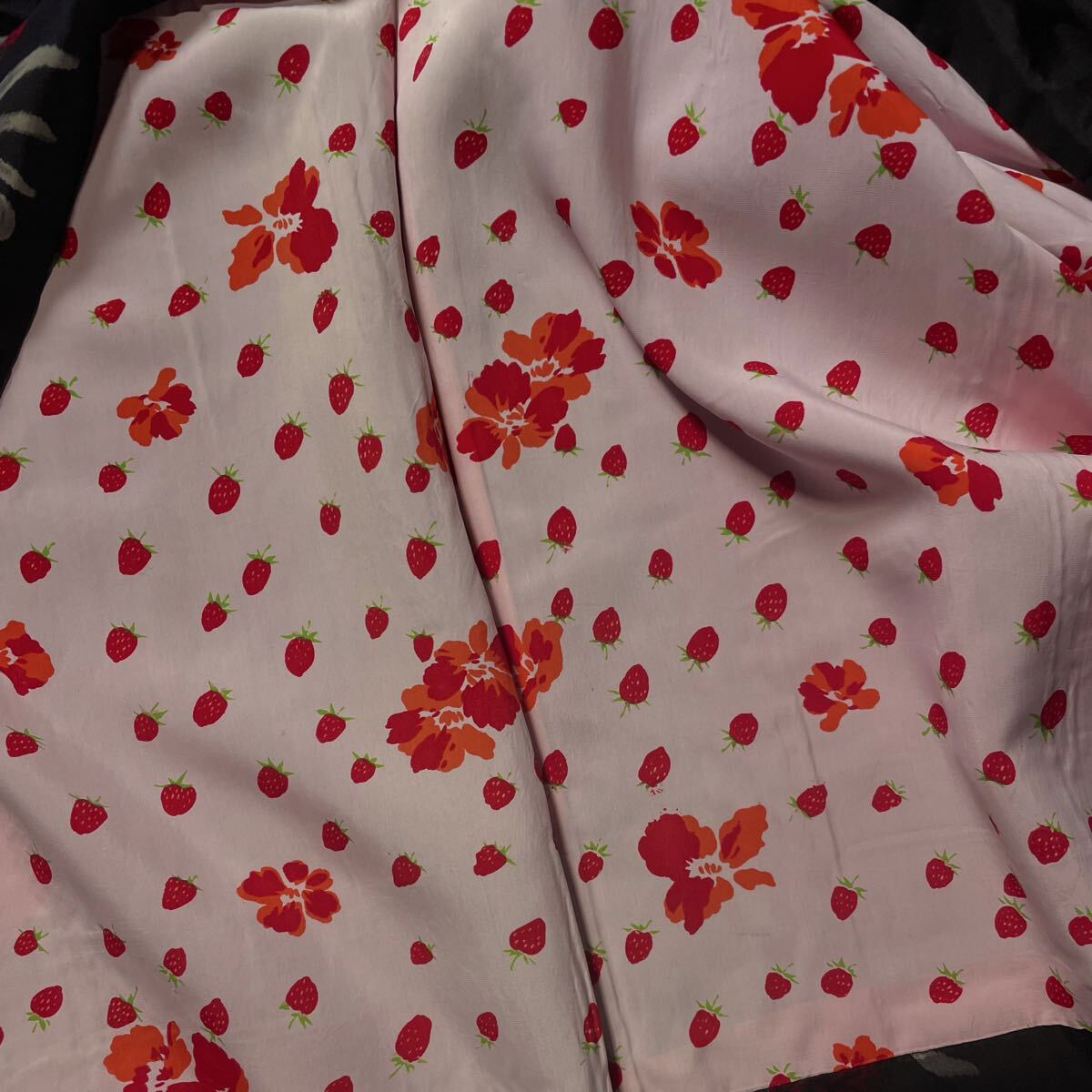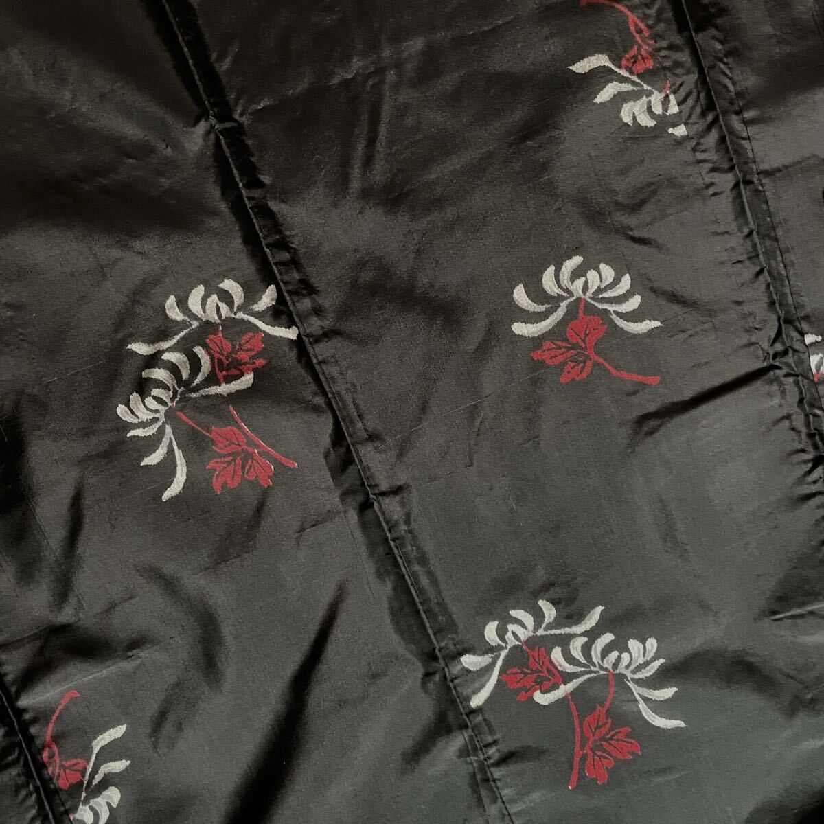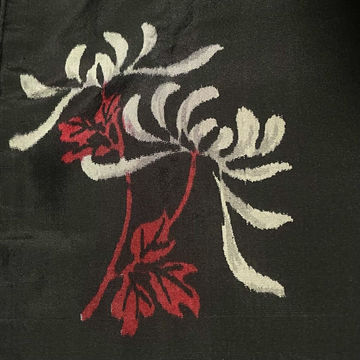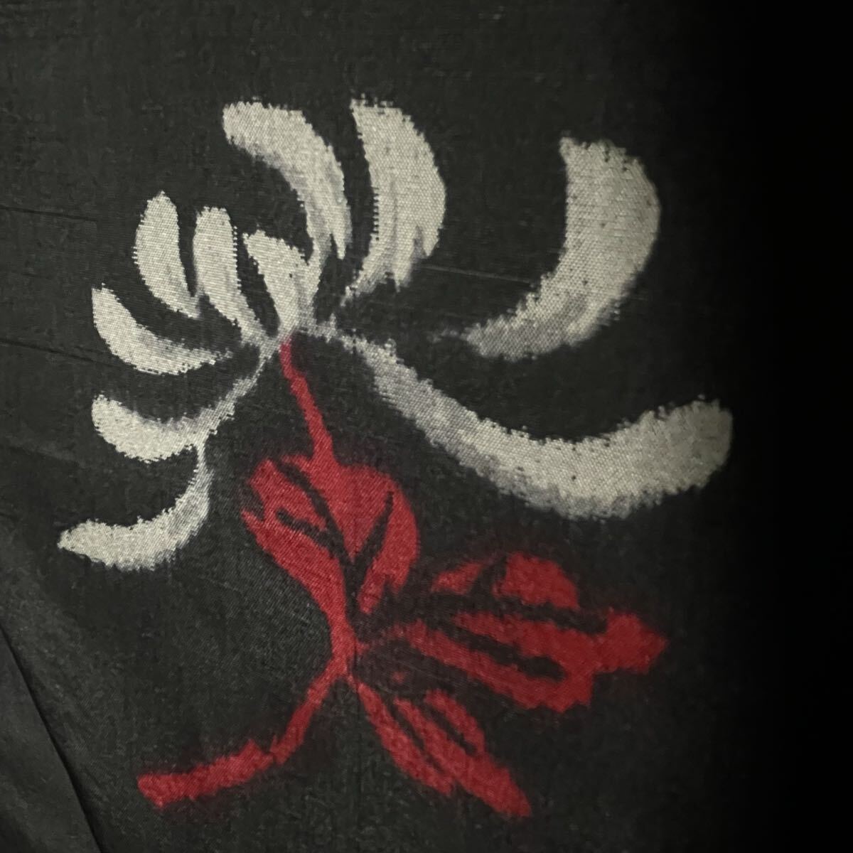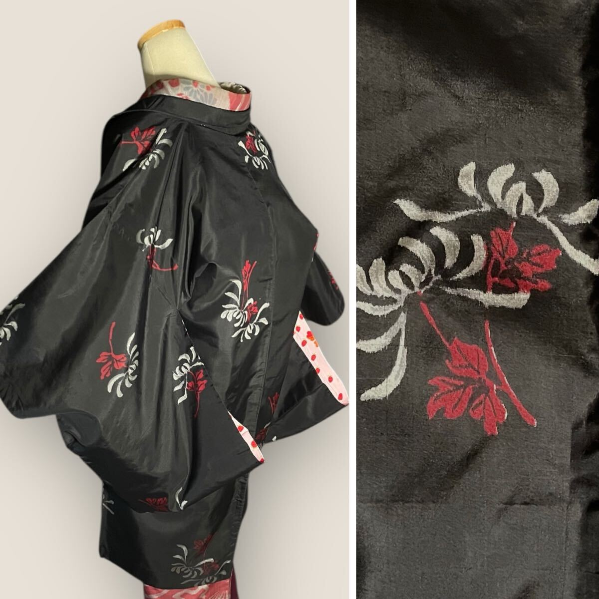 黒地に赤い茎(!)の白菊の飛び柄が不思議な哀愁漂うアンティーク長羽織。羽裏はとっても乙女ないちご柄です。