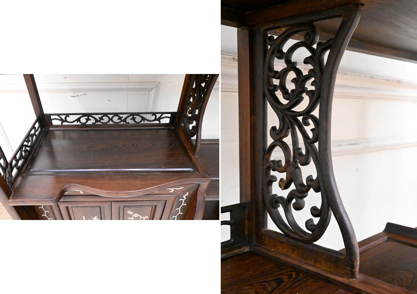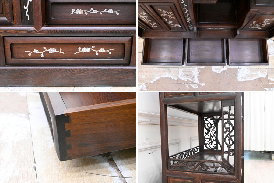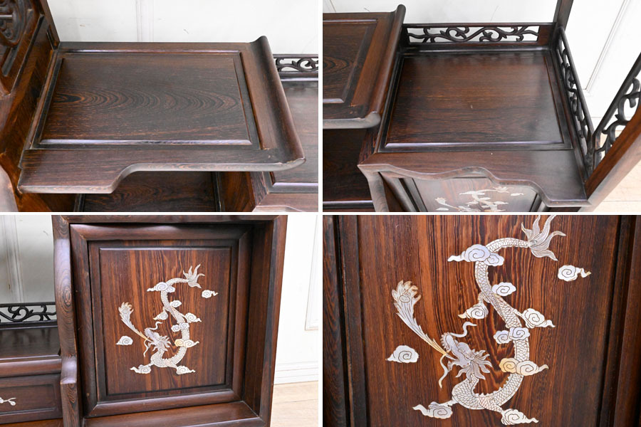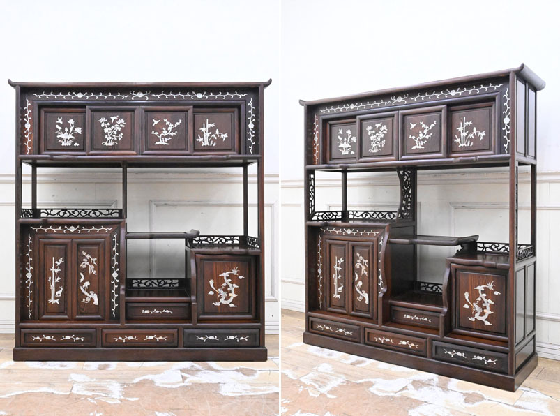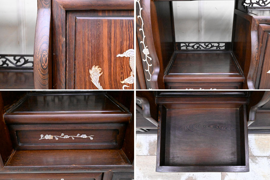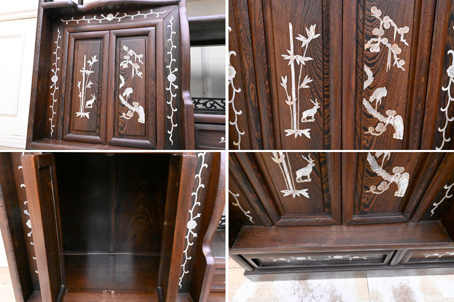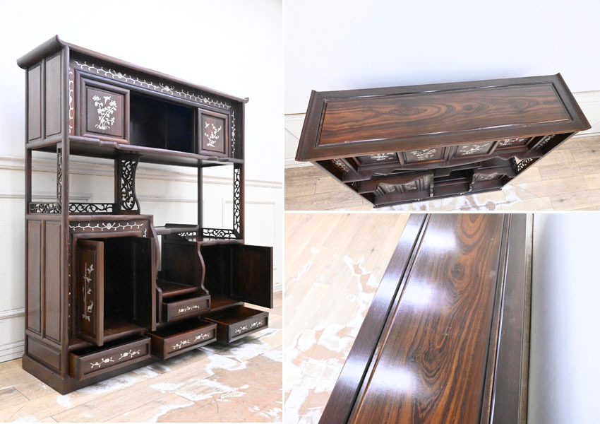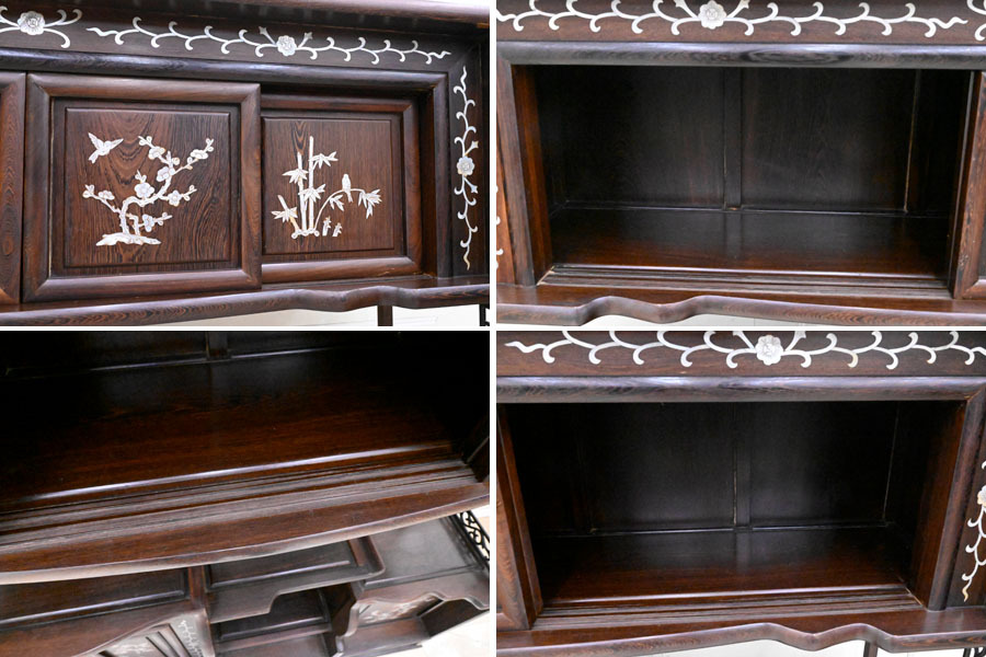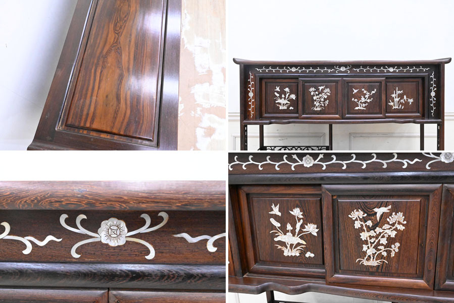 ----------------------------------------------------------------------------------------- ●送料や注意事項は必ずご確認下さい。落札後にトラブルになるケースが増えております。● ◆コンディションは写真・文章にて記載して有りますが、全てのキズの写真は掲載致しておりません。大きなダメージを除き見落とし、記載漏れが有る事はご了承下さい。 ◆当サイトにて出品する商品は多種多彩で、当方商品知識の無い物も多数ありますので落札後の質問やメンテナンス等にはお答えできません。 ◆入札された時点で、画像、文章をご理解していただいたものと判断させていただきます。不明な点は前もってQ&Aからお願い致します。入札後の質問やお電話等でのキャンセルは一切受け付け致しません。 ◆商品説明に「ノークレーム」と記載しているものに関しては、如何なる状況で届いても保証致しません。詳しくは注意事項の「商品到着後について」の最後に記載しておりますのでご確認下さい。 ---------------------------------------------------------------------------------------- 希少で高価な本鉄刀木を全てに使用した大変贅沢なお品です。 よく見る偽鉄刀木とは違いますのでお見逃しの無いように。 幅129.5 奥35 高137.5cm 年代物ですのでキズ、ヨゴレ、接合部スキマ、スライド扉少し反りにより開け閉め少し固い、スライド扉閉めた時少し隙間、中板開きによる隙間、向かって左側面下部に虫食い穴?等有ります。 こちらのお品は運送事故を含めノークレームノーリターンでの出品となります。 運送補償も有りませんのでご了承ください。 | ||