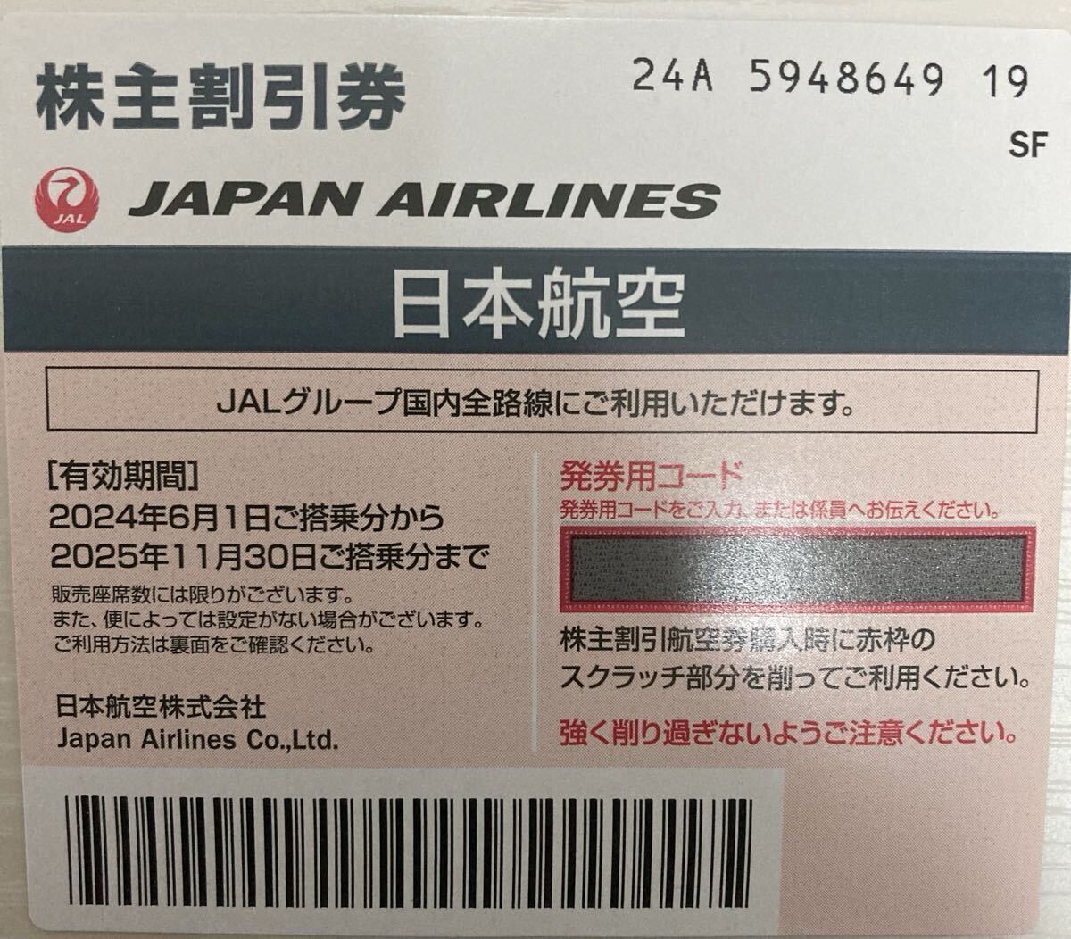 JAL株主優待券 日本航空 番号通知のみ可能 2025.11.30まで有効