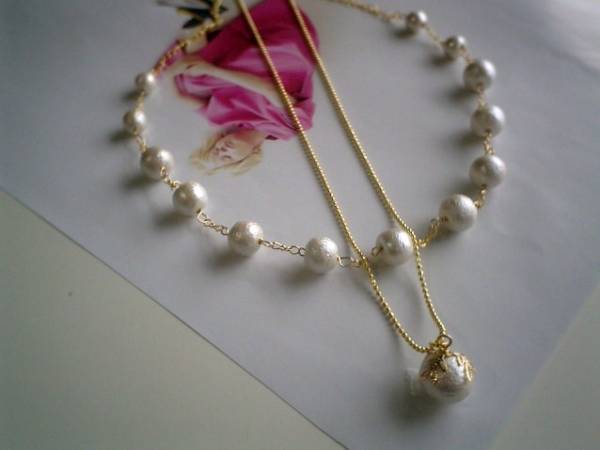 可愛さのスパイス・・シリーズです♪パール・レシピ帖・・ふんわりやさしいコットンパールのネックレス2点セットです♪色々な組み合わせで楽しんでいただけます♪とても軽いのでずっと着けていただけたらと思います♪シンプルなデザインのネックレスは8ミリ、10ミリのオフホワイトのコットンパールを華奢なチェーンに繋ぎました♪長さは全長60センチ位で調節自由です♪12ミリのコットンパールはシックな座金やボールチェーンを合わせてやさしい表情です♪長さは74センチ+アジャスター10センチで最長84センチくらいです♪単品やお揃いのネックレスやブレスレットも出品しています♪シンプルで飽きのこないいつまでも着けられるデザインを考えて作りました!ハンドメイドをご理解頂いてノークレーム、ノーリターンでお願いします