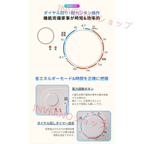 • 【ダイヤル回り操作】指で回りだけの簡単な操作で、お年寄りにとっても優しい。 電力調整ボタン 少量な衣類や夏用の薄手の服を乾燥させる場合は、電力「小」を使用するとより省エネで環境にも優しいです。