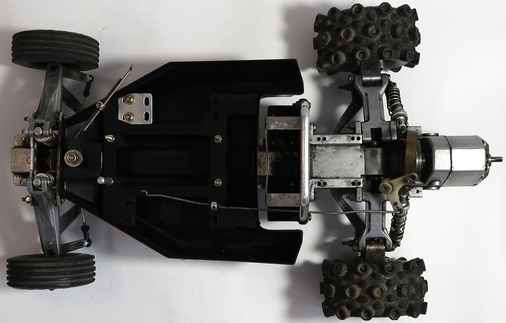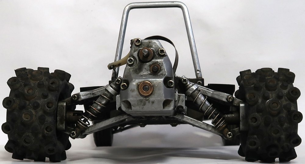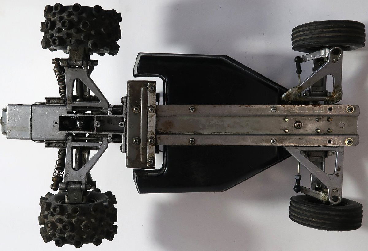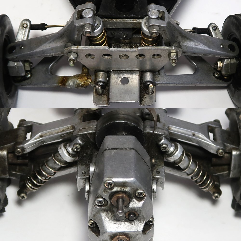 出品は画像の物が全てです。パーツの不足多数、エンジンなし、破損ありの状態です。使用品ですし古い物ですので擦れ、汚れや所々に擦り傷あります。上から押せばサスは可動しますが、ダンパーにはオイルが入っていないと思われます。右のサスペンションアーム下が折れて外れています。画像をご覧ください。必要なパーツがないので一切の動作確認は取れておりません。分かる事は以上です。お取引後は一切のサポートはしておりませんので問題があればご自分でご対処ください。お取引後は一切のサポートはしておりません。お取り引き後に説明以外の不足品や説明以外の破損や故障が有ったとしても返品は出来ませんしクレームもお受けできません。問題があれば全てご自分でご対処ください。