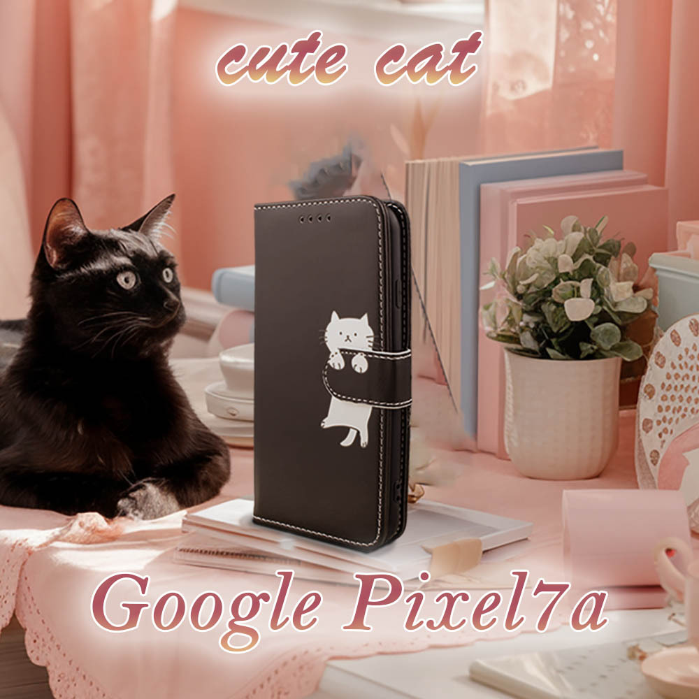 Google Pixel 7a ケース 手帳型 かわいい Pixel7a ねこ ネコ 猫 人気 カバー ベルト付 黒 ブラック レザー 革 送料無料 安い スマホケース
