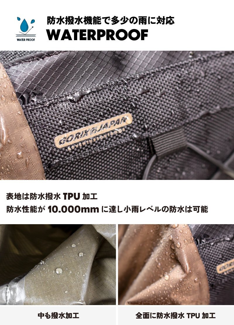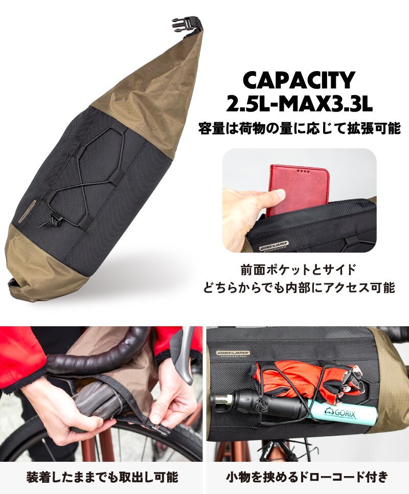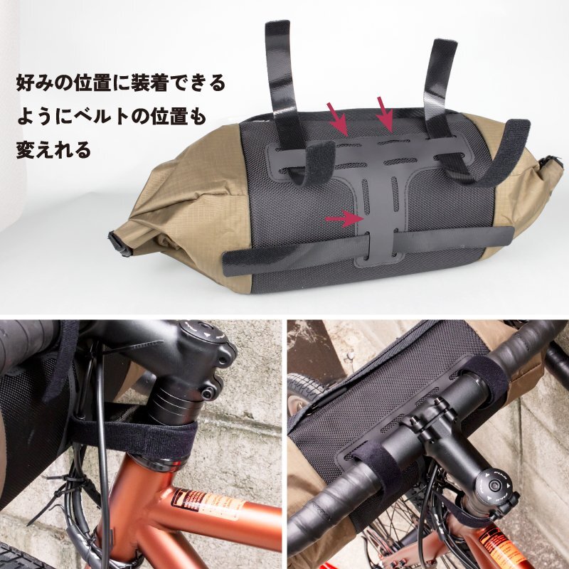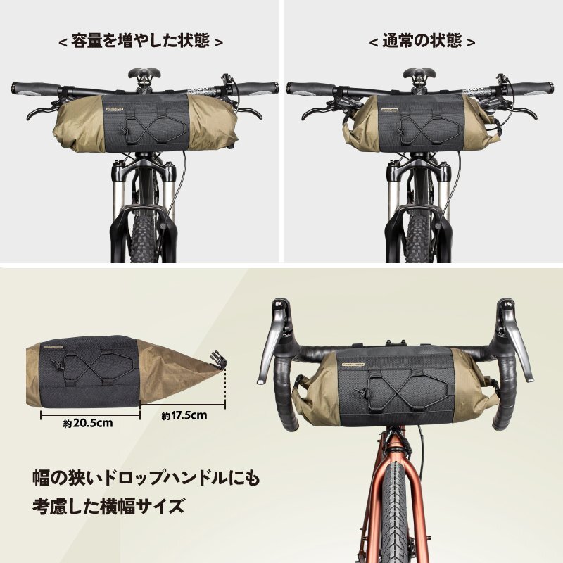 EXPLANATION 荷物の量に応じてロールして拡張する容量、そしてサイドから荷物を取出す事も可能。 メイン素材はとても分厚く丈夫な1680Dナイロンで強く扱いやすい。 バッグ前面にはTPU防水撥水加工を施し雨や水を弾きます。 ドロップハンドルへの装着もできる使い勝手の良いハンドルバーバッグ。 3点で固定し振動や揺れに対応。 ロードバイクやMTB、クロスバイクなどあらゆる自転車に装着が可能に。 土系カラーはアウトドアなオフロードにもマッチ。 ツーリングやブルペ、自転車通勤など様々な場面にあったフロントバッグです。 FEATURES ●バッグ全体表面にTPU防水撥水加工 ●黒ボディ部分は(1680Dナイロン)で厚くかなり丈夫 ●容量は荷物の量に応じて拡張可能 ●形状をキープし型崩れしない ●ドロップハンドルにも装着可能 ●フロントライトの装着も可能 ●3点固定で揺れない ●土系カラーでアウトドアな印象に [容量] 2.5L~最大3.3Lでメインのジップポケット、もしくは横から収納する事が可能。 また前面には小物を挟めるドローコード(紐)付き。 [防水撥水機能] 表地は防水撥水TPU加工で、防水性能が10.000mmに達し、小雨レベルの防水は可能。※完全防水ではありません [素材] メイン素材には分厚く頑丈な1680Dナイロンを採用し、バッグがくしゃっと潰れずにきれいな形をキープ。 強度も高く耐摩耗性と耐久性に優れています。 [ドロップハンドル] 幅の狭いドロップハンドルにも考慮した横幅サイズ。 フラットハンドルだけでなくドロップハンドルのロードバイクでもお使い頂けます。 [デザイン] 落ち着いたカラーはアウトドアっぽくもあり、都会的でもあり様々な自転車にマッチします。 デザイン性があるので自転車のファッションを楽しめます。 商品内容バッグ、ベルクロストラップ3本 素材黒ボディ1680Dナイロン、両側オープニング200Dナイロン、バッグ全体表面にTPU防水撥水加工 仕様フリーオープニング(バッケル付)、防水撥水、長さ調整可能仕様のベルクロストラップ サイズ長さ約22-55cm、直径約12cm(円柱状)、ベルクロストラップ長さ24cm 容量2.5L~最大3.3L 重量300g 固定位置ハンドルバー、ステム 防水性能10,000mm |