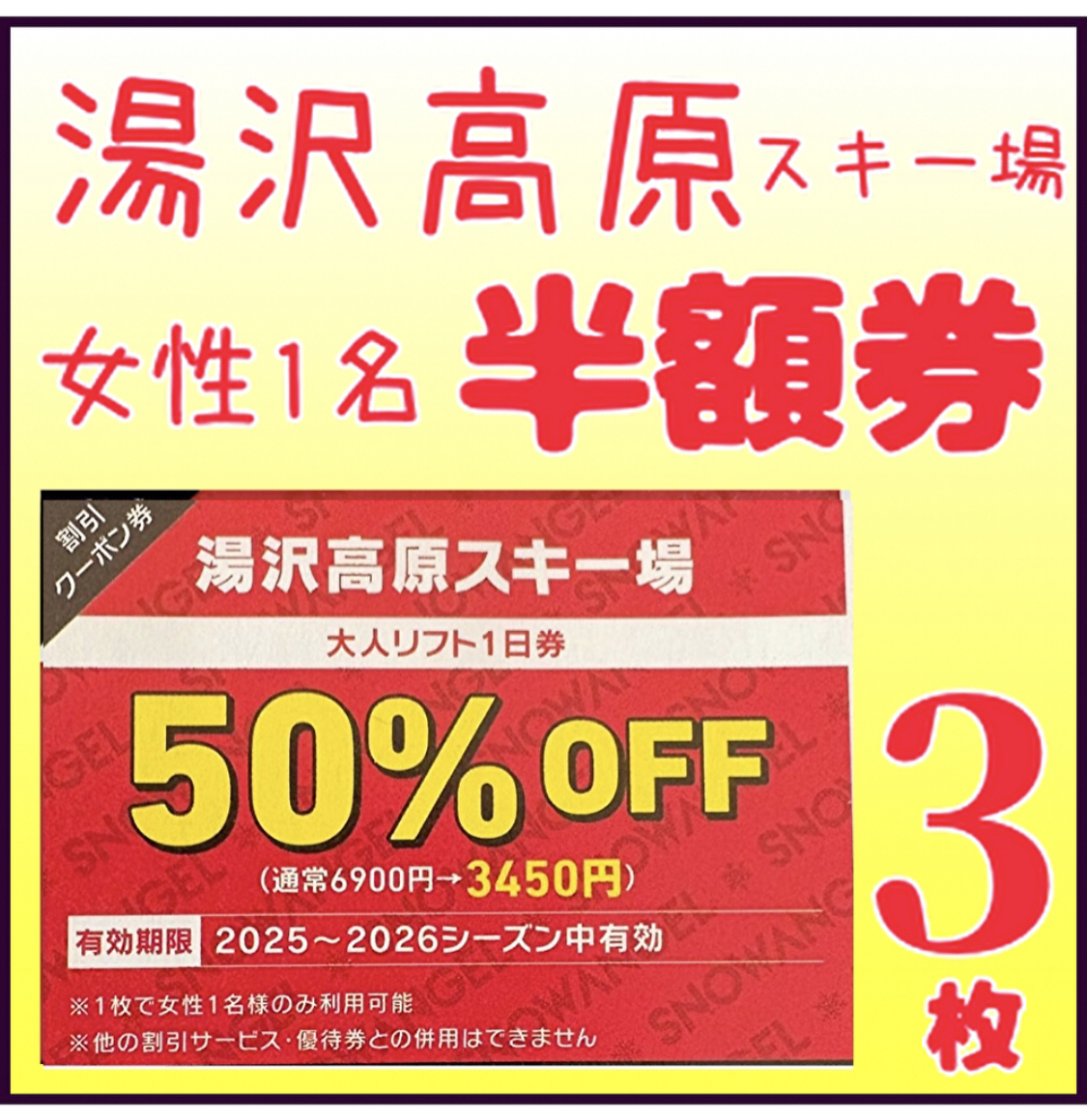 湯沢高原スキー場 女性1名様分リフト半額券 湯沢高原スキー場リフト券半額券 3枚 湯沢スキー場