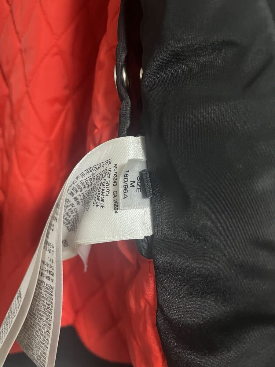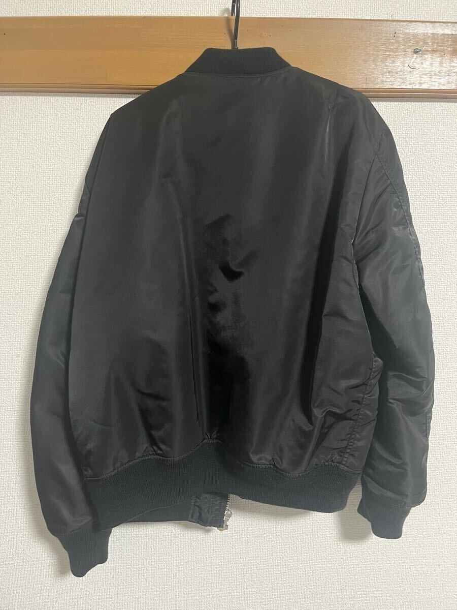 ナイロン製のブラックMA-1ジャケット、フロントジッパーとポケット付き。サイズはMとなります。
