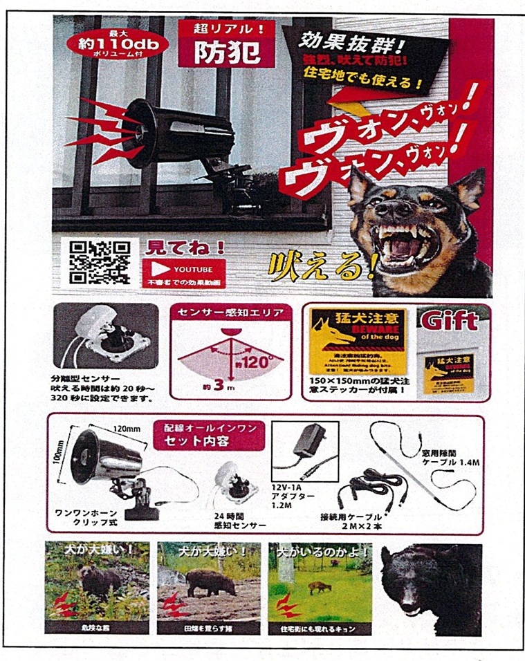 【仕様】犬の吠え声でクマを寄せ付けない モバイルバッテリー別途