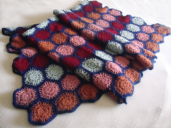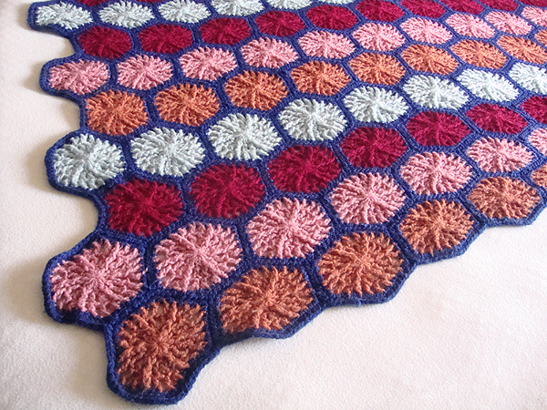 オレンジ、ピンク、赤、水色の六角形モチーフに青でトリミングしたお品です。