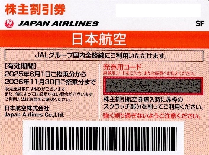 JAL株主優待券5枚売り。期限2026年11月30日。