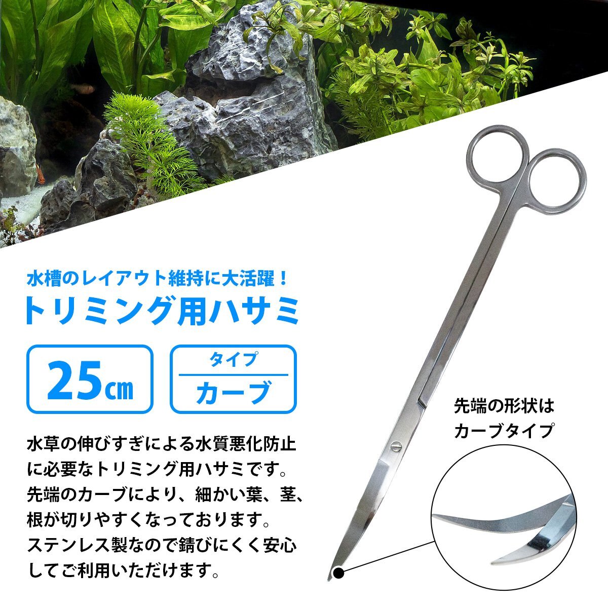 商 品 説 明水槽のレイアウト維持に大活躍!トリミング用ハサミです!