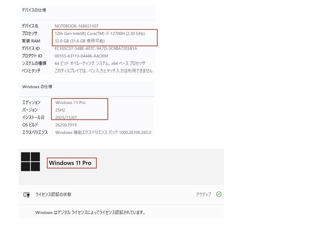 Windows 11 Pro 64bit 新規OS 2025/11/7 インストール |