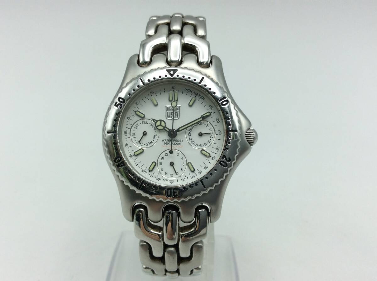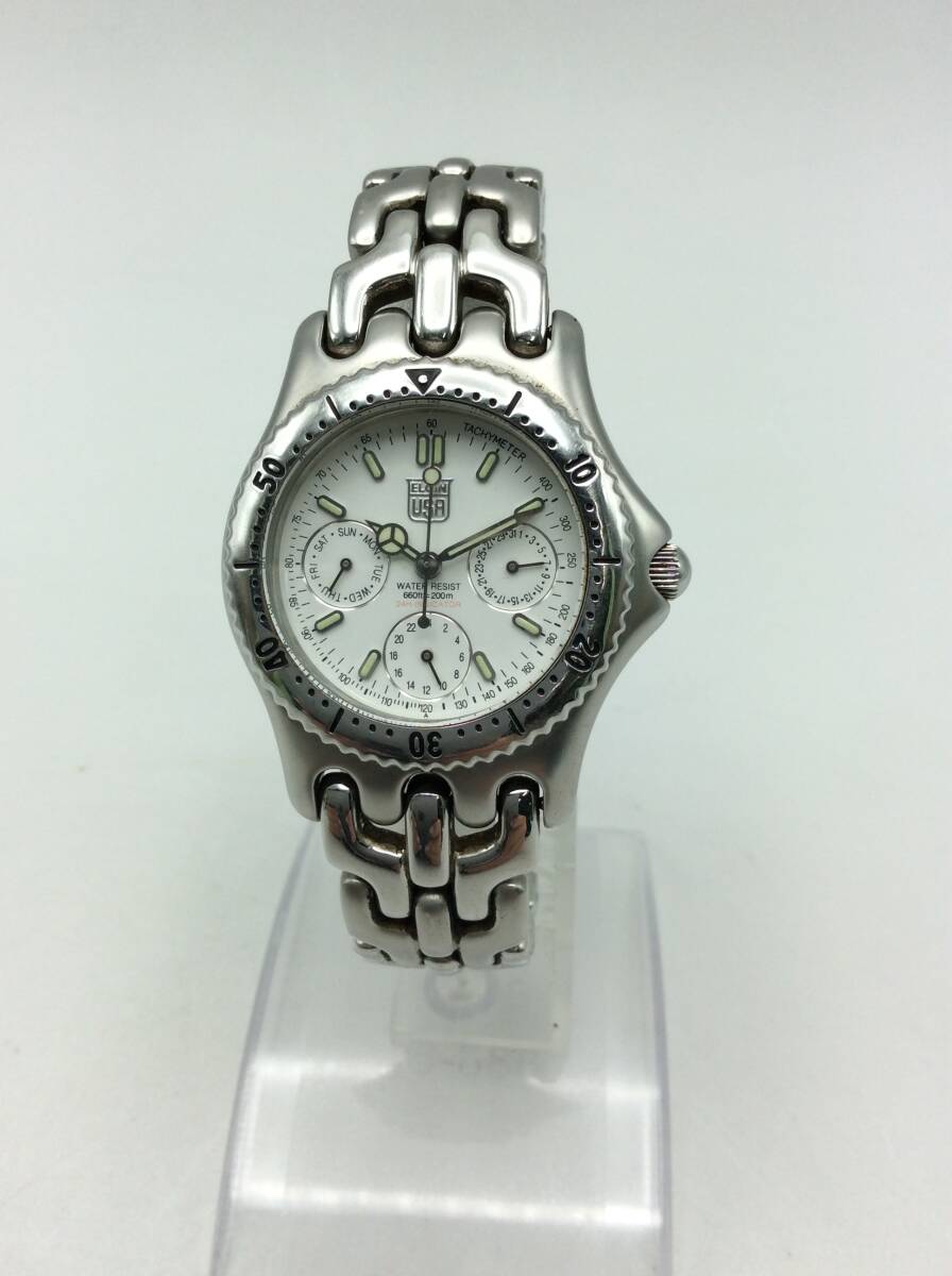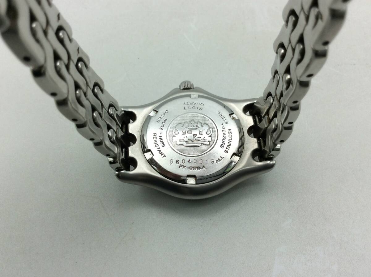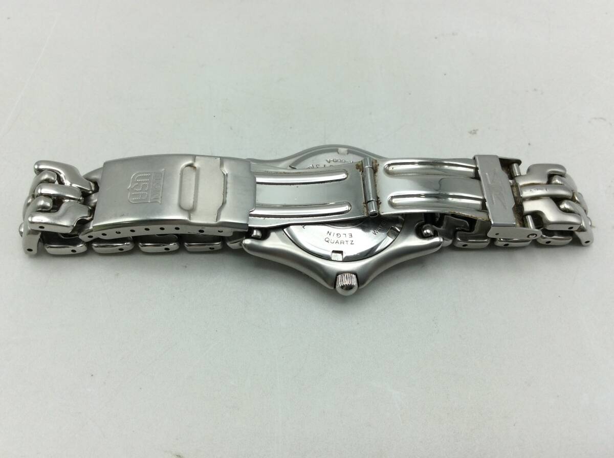 【QZ/不動品】腕時計 ELGIN エルジン 3針 FK-688-A デイデイト ラウンド クォーツ 回転ベゼル シルバー系 メンズ 現状品