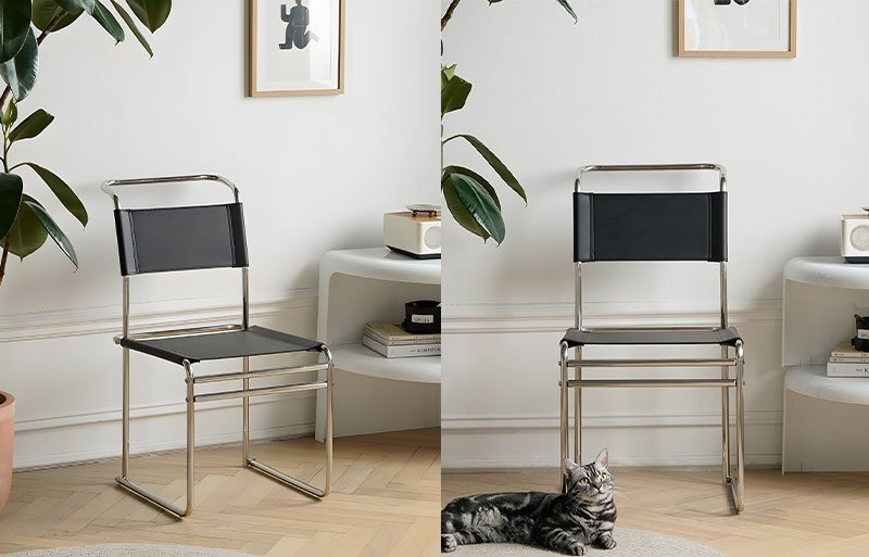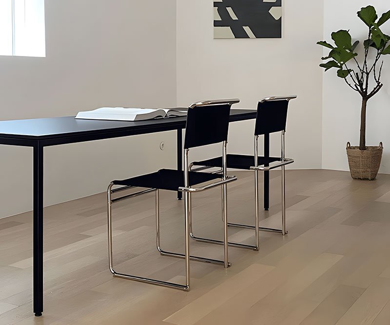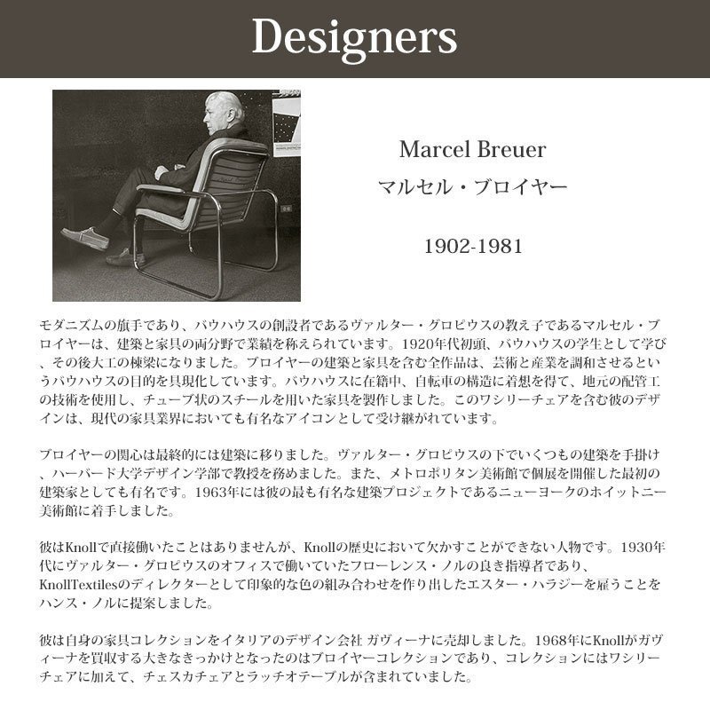 ![]() ”モダニズムの父”のひとりとして知られるMarcel Breuer(マルセル・ブロイヤー)が1925年に手掛けたダイニングチェアの復刻モデル。 素材はスチールパイプとサドルレザー(牛革)のみで、ほぼ直線で構成されたミニマルなデザインです。見た目の通り軽量で、使い勝手も良好。椅子を引きやすいように持ち手をつけ、僅かに斜めにした背もたれにブロイヤーの心遣いを感じられます。 脚裏部分には滑り止め付きで安心。 床へのキズを防止する効果も期待できます。 ■商品詳細 デザイナー:デザイナー:マルセル・ブロイヤー / Marcel Breuer サイズ(約):幅46cm*奥行き51cm*高さ87cm*座面高44cm*座面奥行き38cm 重量(約):3.8kg 材質: サドルレザー(牛革) 脚部分:ステンレス |