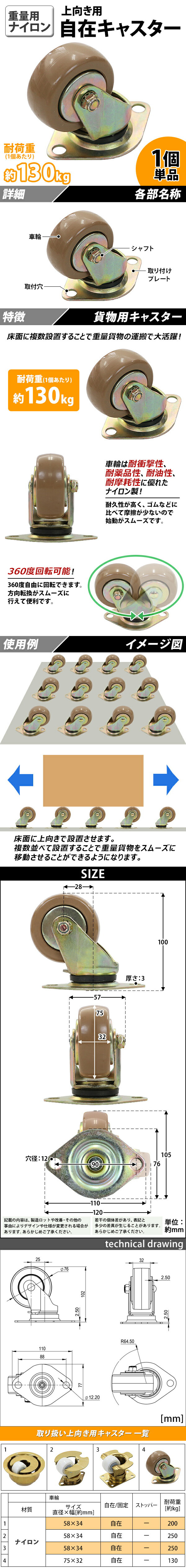 | 商品名 | 送料無料 キャスター 上向き 自在キャスター 重量用 ナイロン製 1個 単品 航空貨物キャスター 耐荷重約130kg(1個あたり) 車輪直径約75mm 幅約32mm 航空貨物用 重量用キャスター 貨物キャスター 貨物用キャスター 航空 空港 自在車 ナイロン車輪 運搬 acstrnyfre9301p |