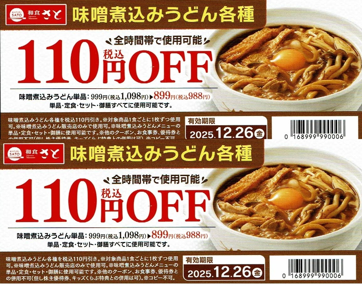 和食さと 味噌煮込みうどん110円割引2枚 2025.12.26